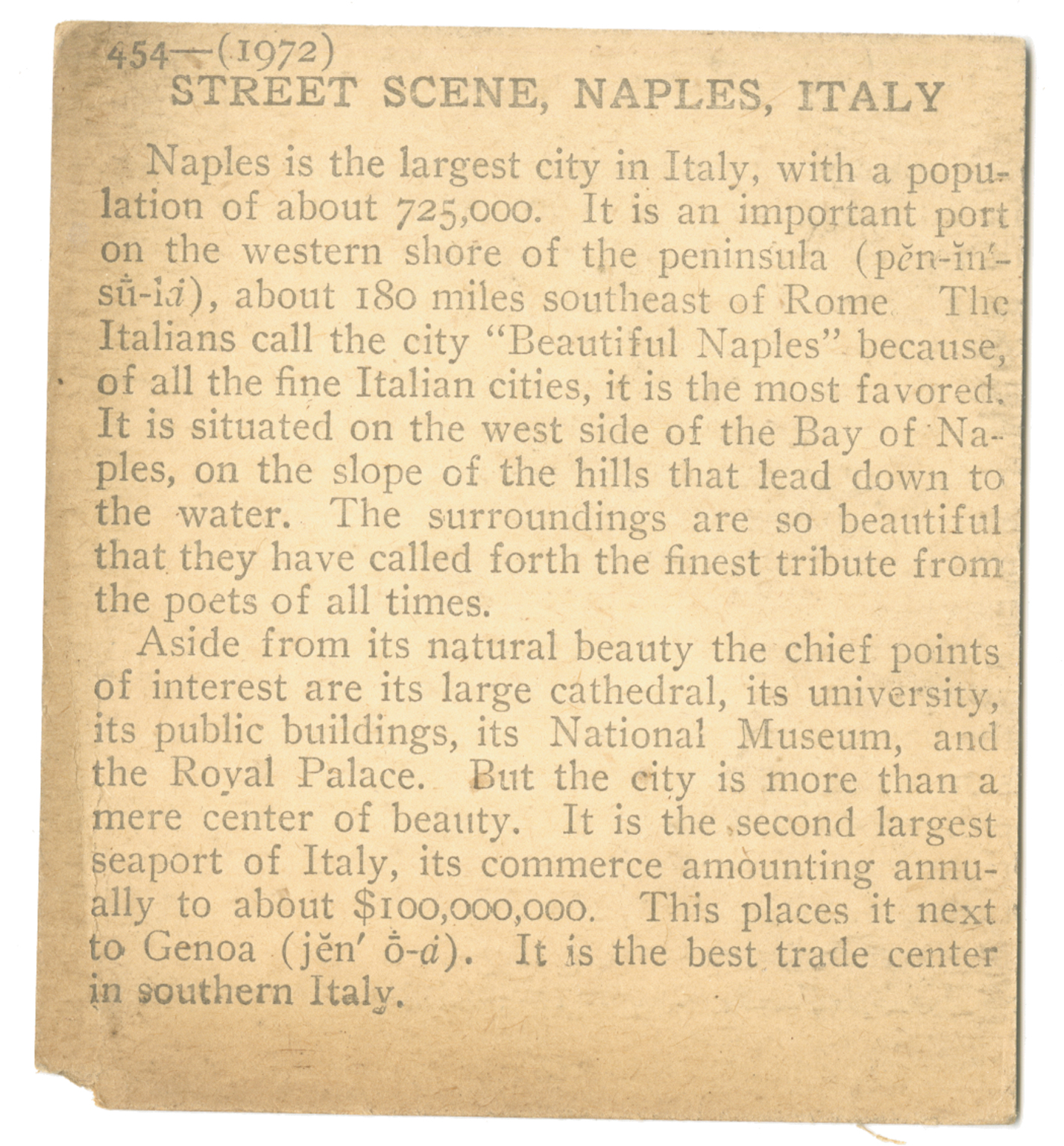 Naples is the largest city in Italy, with a population of about 725,000. It is an important port on the western shore of the peninsula, about 180 miles southeast of Rome. The Italians call the city "Beautiful Naples" because, of all the fine Italian cities, it is the most favored. It is situated on the west side of the Bay of Naples, on the slope of the hills that lead down to the water. The surroundings are so beautiful that they have called forth the finest tribute from the poets of all times. Aside from its natural beauty the chief points of interest are its large cathedral, its university, its public buildings, its National Museum, and the Royal Palace. But the city is more than a mere center of beauty. It is the second largest seaport of Italy, its commerce amounting annually to about $100,000,000. This places it next to Genoa. It is the best trade center in southern Italy.