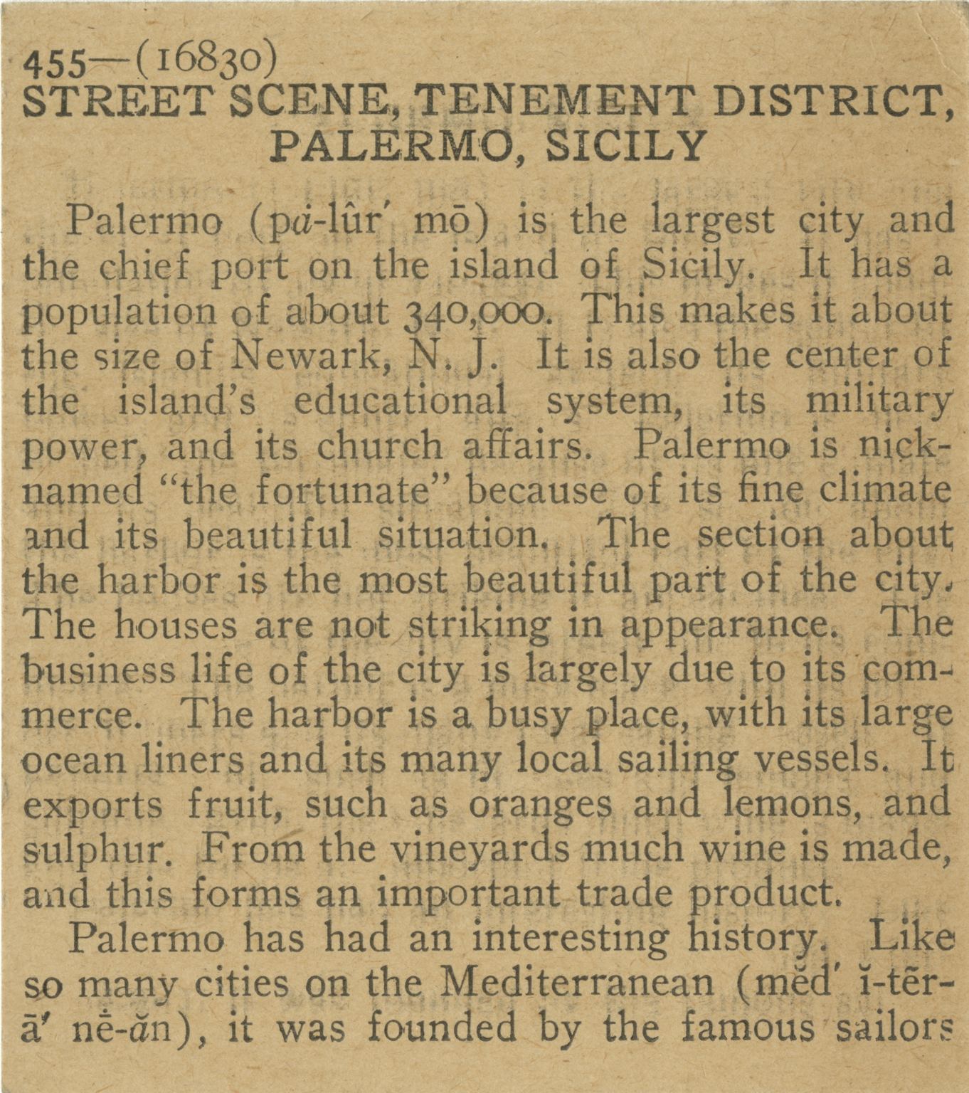 Palermo is the largest city and the chief port on the island of Sicily. It has a population of about 340,000. This makes it about the size of Newark, N.J. It is also the center of the island's educational system, its military power, and its church affairs. Palermo is nicknamed "the fortunate" because of its fine climate and its beautiful situation. The section about the harbor is the most beautiful part of the city. The houses are not striking in apperance. The business life of the city is largely due to its commerce. The harbor is a busy place, with its large ocean liners and its many local sailing vessels. It exports fruit, such as oranges and lemons, and sulphur. From the vineyards much wine is made, and this forms an important trade product. Palermo has had an interesting history. Like so many cities on the Mediterranean, it was founded by the famous sailors
