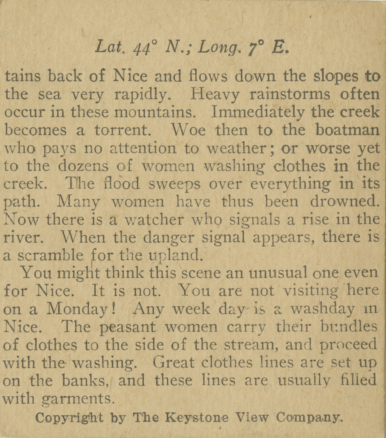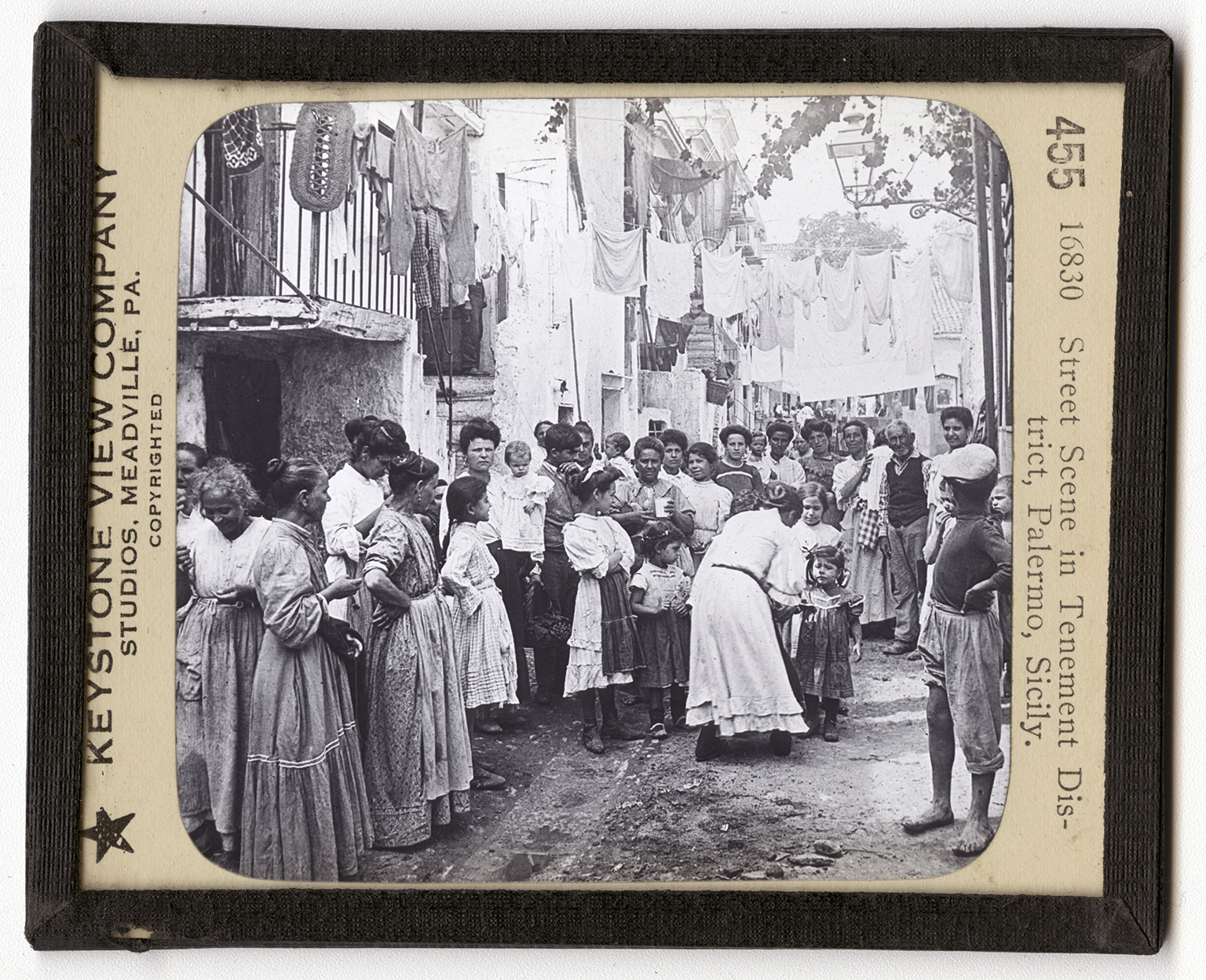 of ancient times the Phoenicians. They called their city Panormus. The legions of Carthage, a city of Northern Africa, captured the city from the Phoenicians. It was then taken by the Romans, 2,100 years ago. The Carthagians, under their famous general, Hamilcar Barca, tried to retake it. They besieged the city for 3 years. Since the time of the Romans it has been in the possession of the Germans and of the French, until finally it belongs to the Italians. Here you see a common sight in the streets of the city. There are many poor people of the happy-go-lucky sort. They sleep in tenement houses, but spend most of their time lounding and gossiping on the streets. You will observe that their clothes lines stretch entirely across the highway.