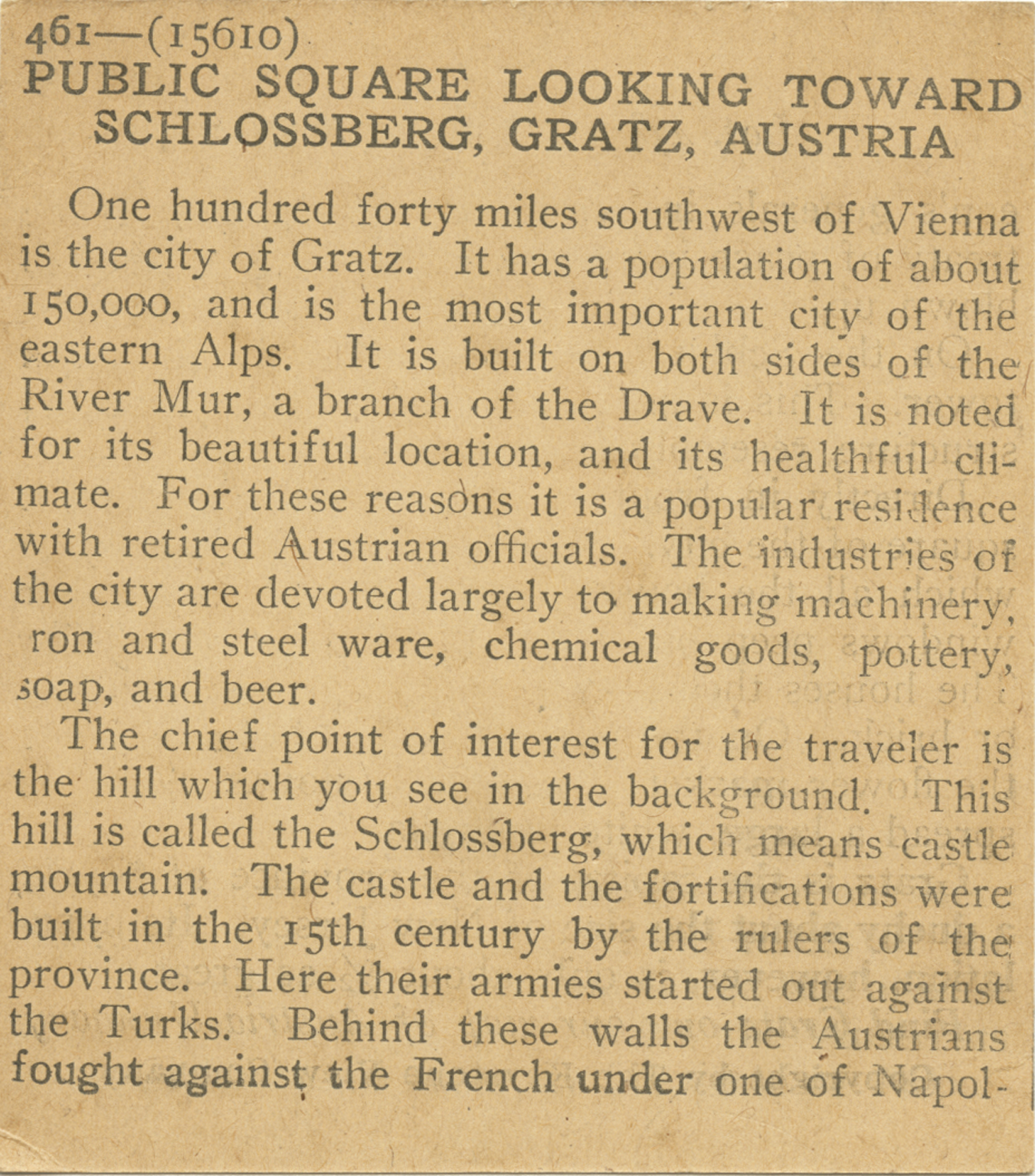 One hundred forty miles southwest of Vienna is the city of Gratz. It has a population of about 150,000, and is the most important city of the eastern Alps. It is built on both sides of the River Mur, a branch of the Drave. It is noted for its beautiful location, and its healthful climate. For these reasons it is a popular residence with retired Austrian officials. The industries of the city are devoted largely to making machinery, iron and steel ware, chemical goods, pottry, soap, and beer. The chief point of interest for the travelers is the hill which you see in the background. This hill is called the Schlossberg, which means castle mountain. The castle and the fortification were built in the 15th century by the rulers of the province. Here their armies started out against the Turks. Behind these walls thr Austrians fought against the French under one of Napol-
