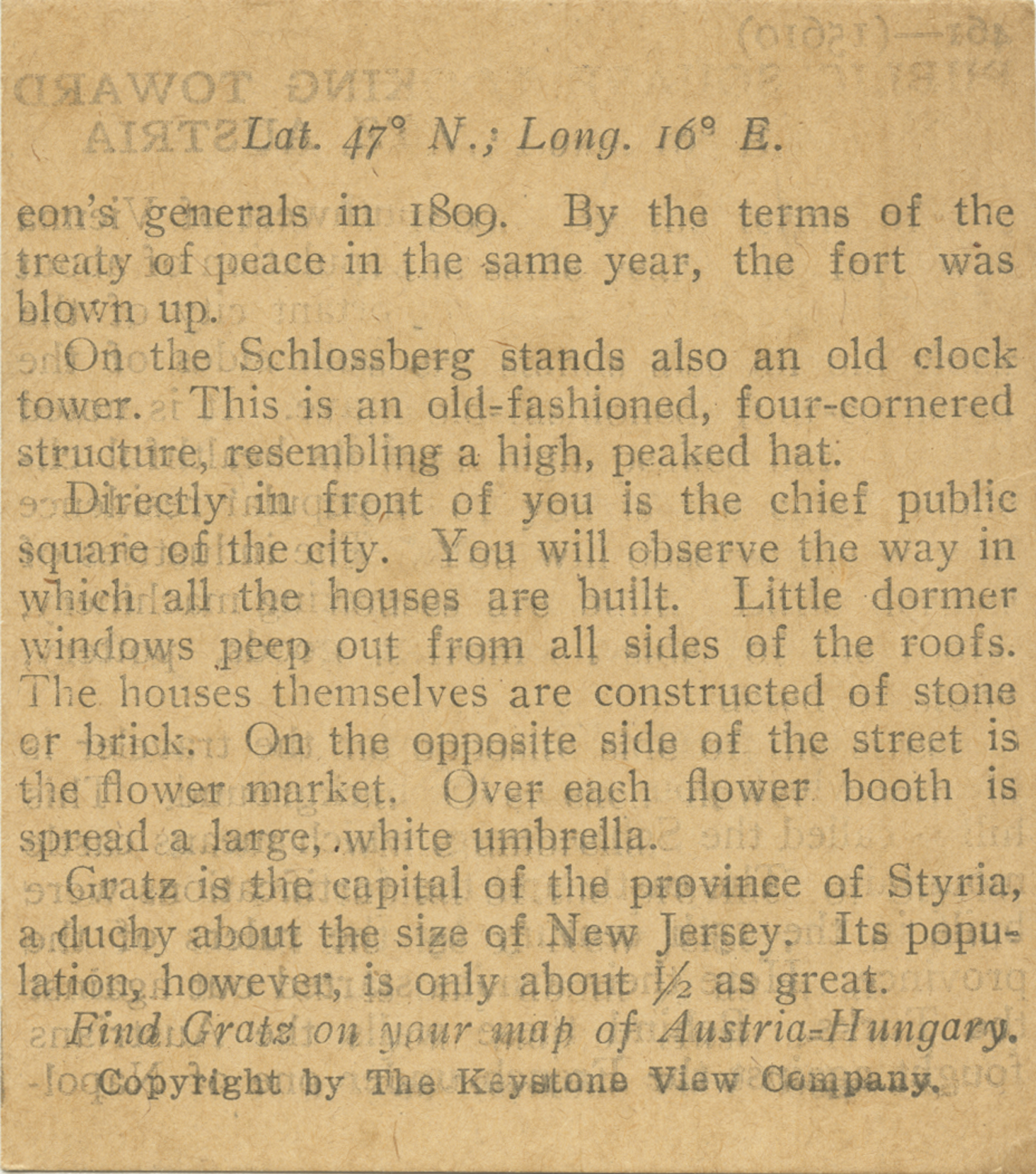 eon's general in 1809. By the terms of the treaty of peace in the same year, the fort was blown up. One the Schlossberg stands also an old clock tower. This is an old-fashioned, four-cornered structure resembling a high, peaked hat. Directly in front of you is the chief public square of the city. You will observe the way in which all the houses are built. Little dormer windows peep out from all sides of the roofs. The houses themselves are constructed of stone or brick. On the opposite side of the street is the flower market. Over each flower booth is spread a large, white umbrella. Gratz is the capital of the province of Styria, a duchy about the size of New Jersey. Its population, however, is only about 1/2 as great. Find Gratz on your map of Austria-Hungary.