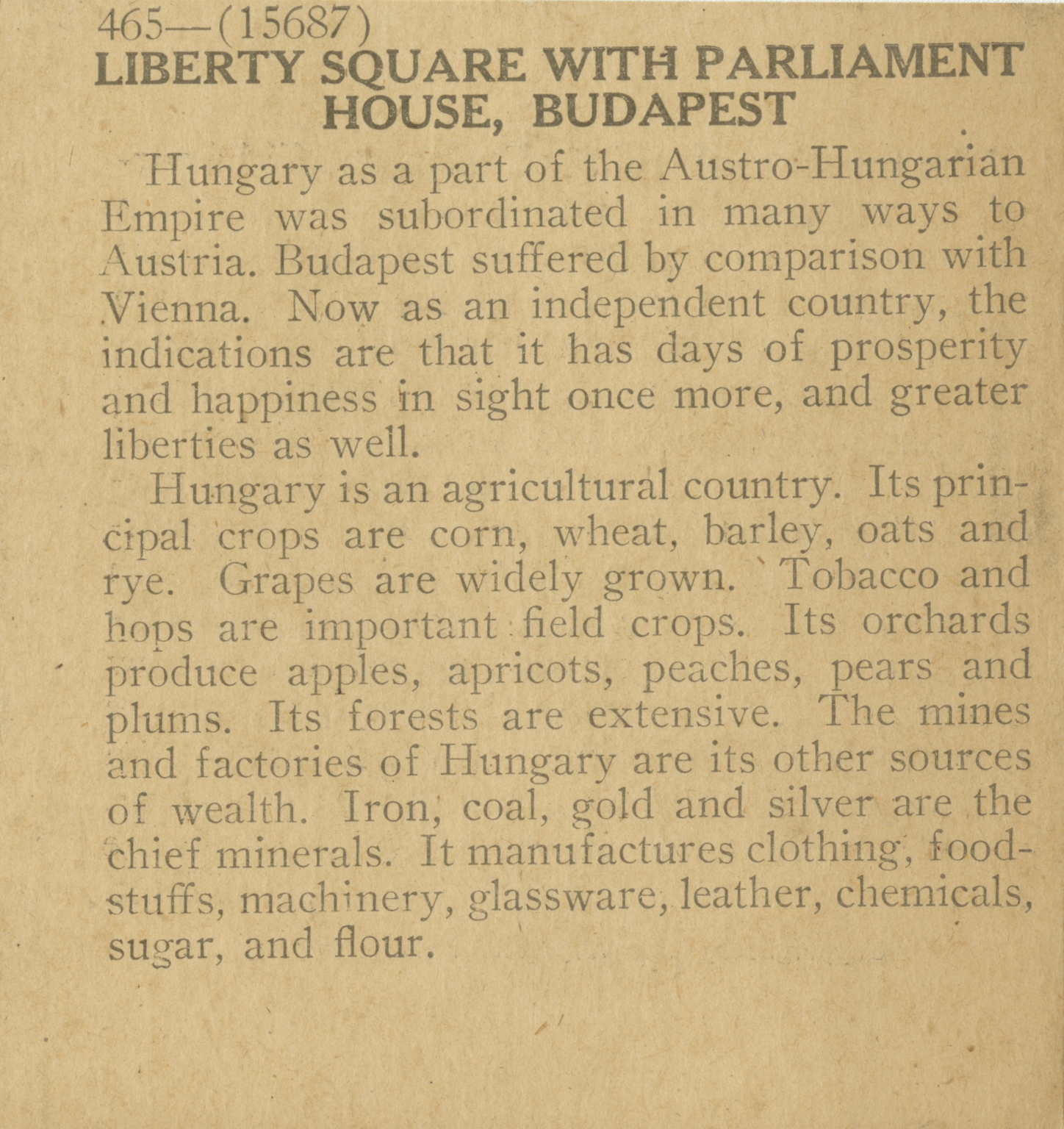 Hungary as a part of the Austro-Hungarian Empire was subordinated in many ways to Austria. Budapest suffered by comparison with Vienna. Now as an independent country, the indications are that is has days of prosperity and happiness in sight once more, and greater liberties as well. Hungary is an agriculture country. Its principal crops are corn, wheat, barley, oats and rye. Grapes are widely grown. Tobacco and hops are important field crops. Its orchards produce apples, apricots, peaches, pears and plums. Its forests are extensive. The mines and factories of Hungary are its other sources of wealth. Iron, coal, gold and silver are the chief minerals. It manufactures clothing, food-stuffs, machinery, glassware, leather, chemicals, suagr, and flour.