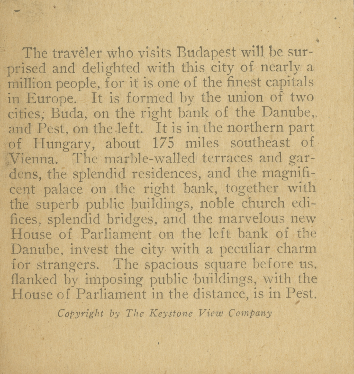The traveler who visits Budapest will be surprised and delighted with this city of nearly a million people, for it is one of the finest capitals in Europe. It is formed by the union of two cities, Buda, on the right bank of the Dunabe, and Pest, on the left. It is in the northern part of Hungary, about 175 miles southeast of Vienna. The marble-walled terraces and gardens, the splendid residences, and the magnificent palace on the right bank, together with the superb public buildings, noble church edifices, splendid bridges, and the marvelous new House of Parliament on the left bank of the Danube, invest the city with a peculiar charm for strangers. The spacious square before us, flanked by imposing public buildings, with the House of Parliament in the distance is in Pest.