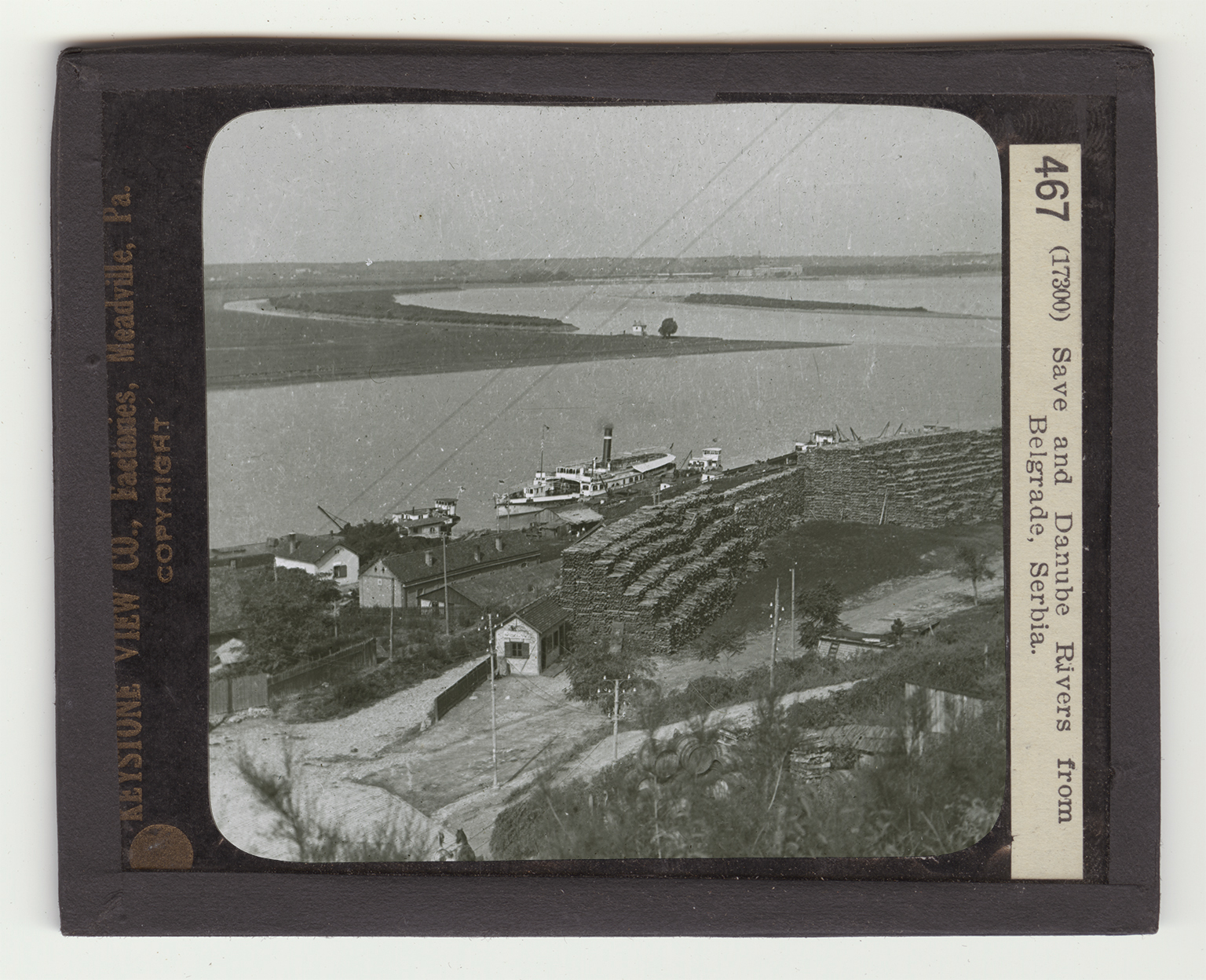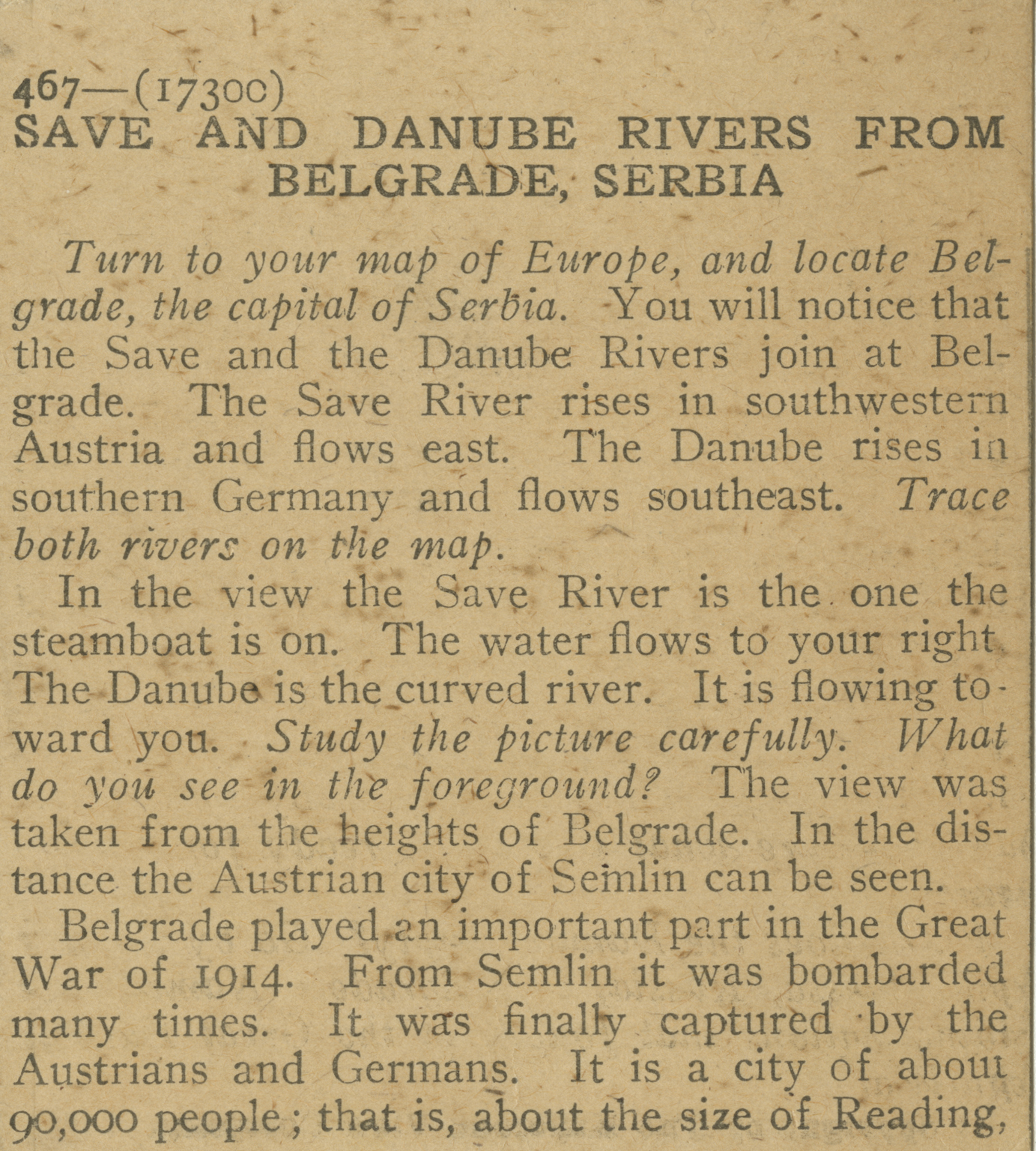 Turn to your map of Europe and locate Belgrade, the capital of Serbia. You will notice that the Save and the Danube Rivers join at Belgrade. The Save River rises in southwestern Austria and flows east. The Danube rises in southern Germany and flows southeast. Trace both rivers on the map. In the view the Save River is the one of the steamboat is on. The water flows to your right. The Danube is the curved river. It is flowing toward you. Study the picture carefully. What do you see in the foreground? The view was taken from the heights of Belgrade. In the distance the Austrian city of Semlin can be seen. Belgrade played an important part in the Great War of 1914. From Semlin it was bombarded many times. It was finally captured by the Austrians and Germans. It is a city of about 90,000 people ; that is, about the size of Reading,