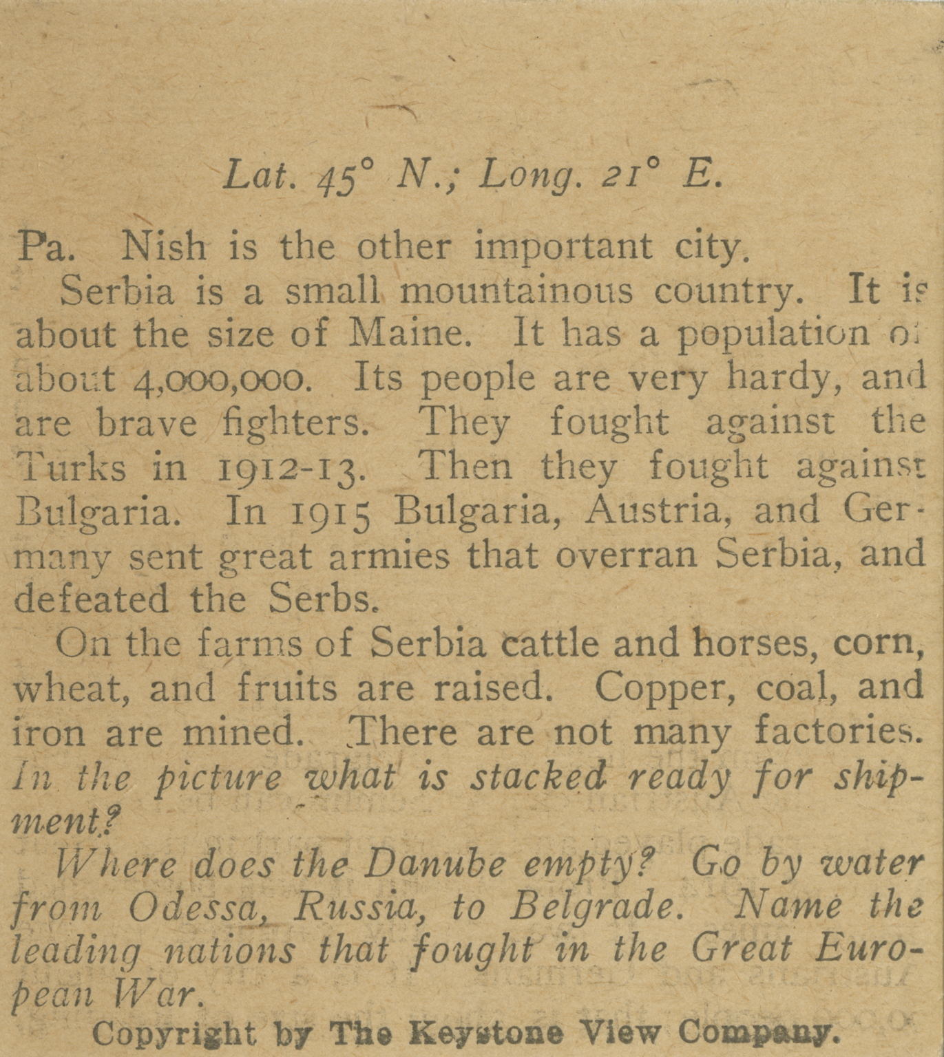 Pa. Nish is the other important city. Serbia is a small mountainous country. It is about the size of Maine. It has a population of about 4,000,000. Its people are very hardy, and are brave fighters. They fought against the Turks in 1912-13. Then they fought against Bulgaria. In 1915 Bulgaria, Austria, and Germany sent great armies that overran Serbia, and defeated the Serbs. On the farms of Serbia cattle and horses, corn, wheat, and fruits are raised. Copper, coal, and iron are mined. There ar enot many factories. In the picture what is stacked ready for shipment? Where does Danube empty? Go by water from Odessa, Russia, to Belgrade. Name the leading nations that fought in the Great European War.