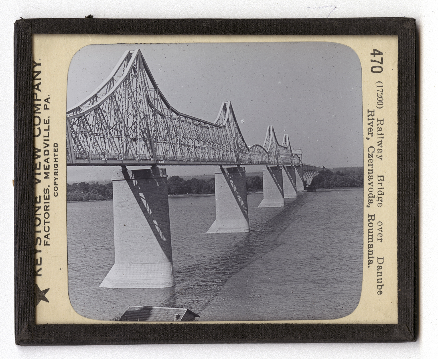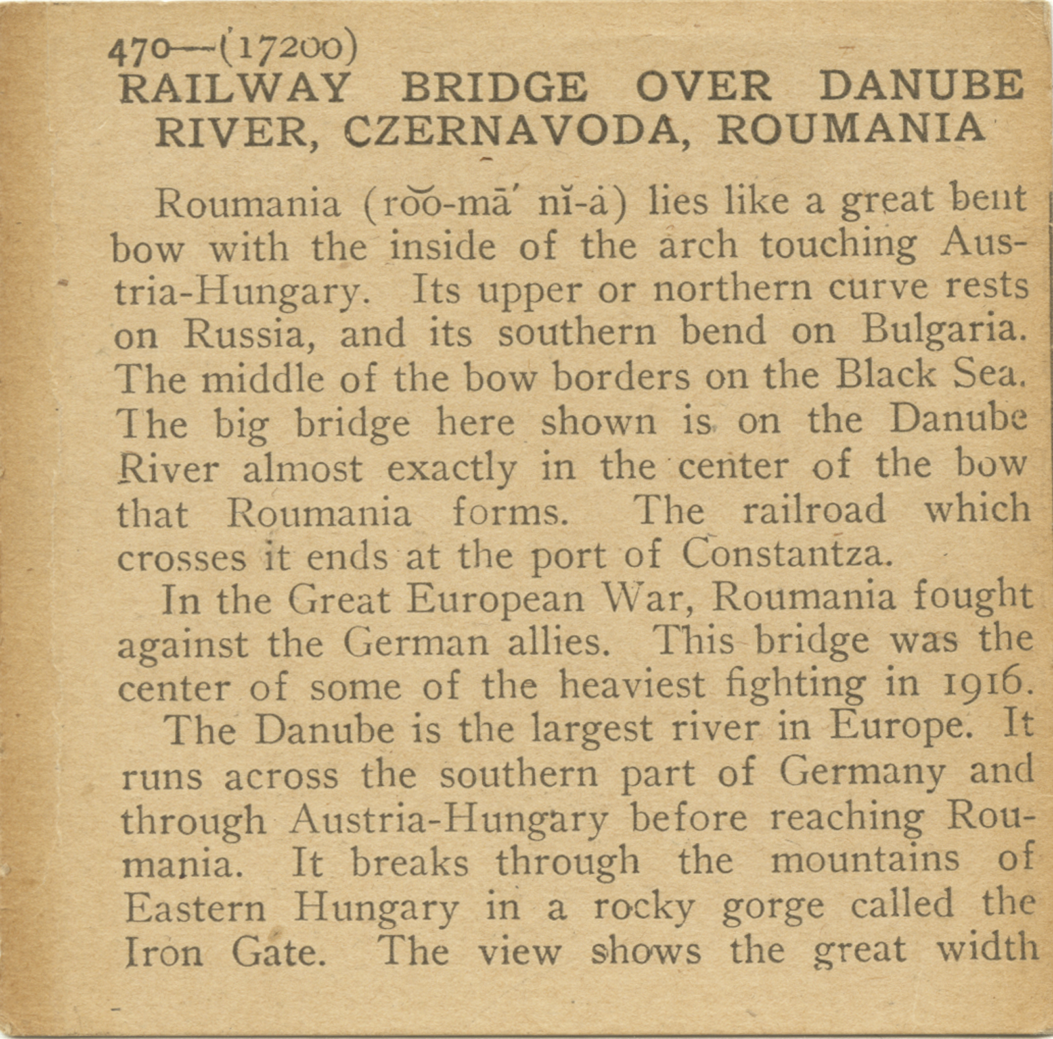 Roumania lies like a great bent bow with the inside of the arch touching Austria-Hungary. Its upper on northern curve rests on Russia, and its southern bend on Bulgaria. The middle of the bow borders on the Black Sea. The big bridge here shown is on the Danube River almost exactly in the center of the bow that Roumania forms. The railroad which crosses it ends at the port of Constantza. In the Great European War, Roumania fought against the German allies. This bridge was the center of some of the heaviest fighting in 1916. The Danube is the largest river in Europe. It runs across the southern part of Germany and through Austria-Hungary before reaching Roumania. It breaks through the mountains of Eastern Hungary in a rocky gorge caled the Iron Gate. The view shows the great width
