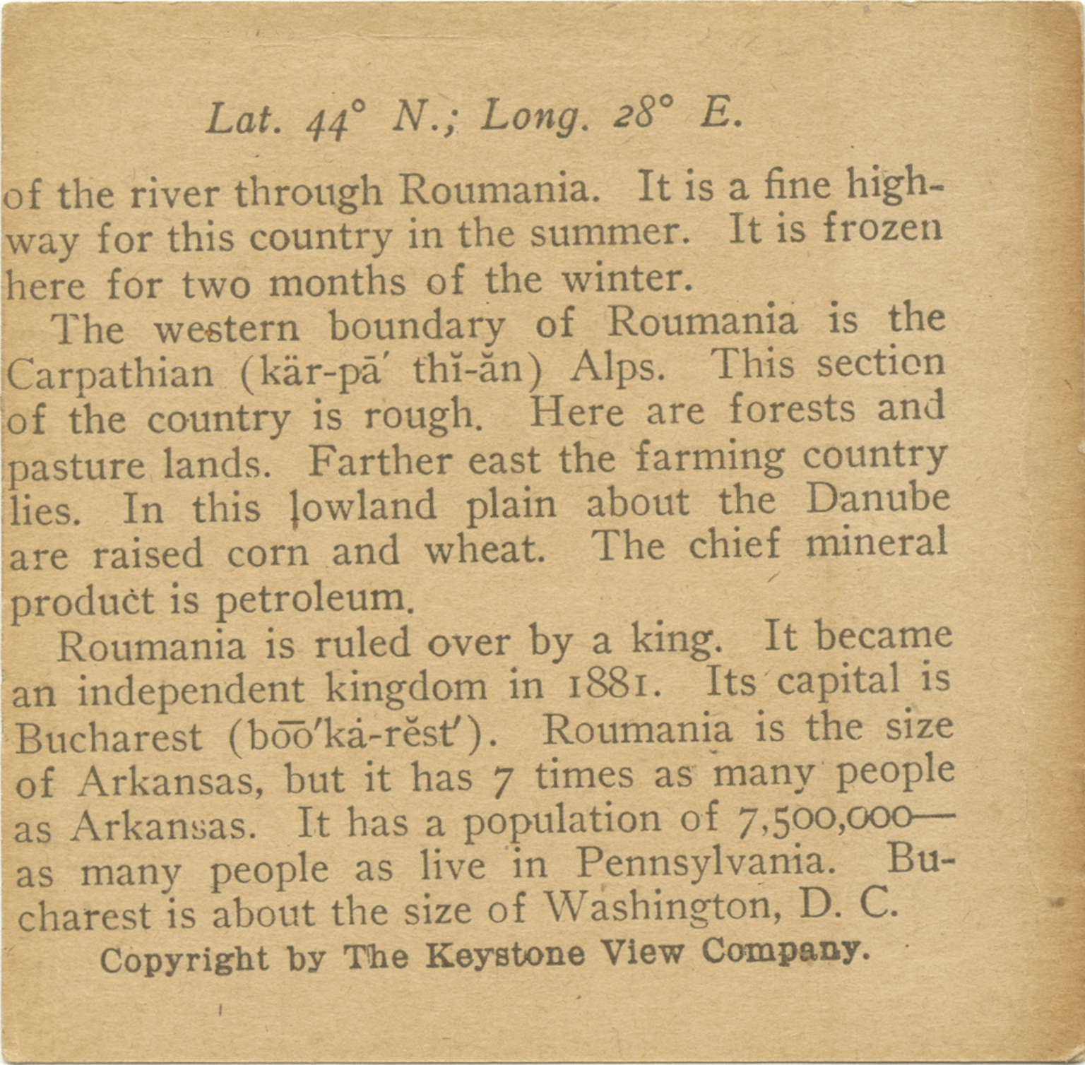 of the river through Roumania. It is a fine highway for this country in the summer. It is frozen here for two months of the winter. The western boundary of Roumania is the Carpathian Alps. This section of the country is rough. Here are forests and pasture lands. Farther east the farming country pasture lands. Farther east the farming country lies. In this lowland plain about the Danube are raised corn and wheat. The chief mineral product is petroleum. Roumania is ruled over by a king. It became an independent kingdom in 1881. Its capital is Bucharest. Roumania is the size of Arkansas, but its has 7 times as many people as Arkansas. It has a population of 7,500,000 - as many people as live in Pennsylvania. Bucharest is about the size of Washington D.C.