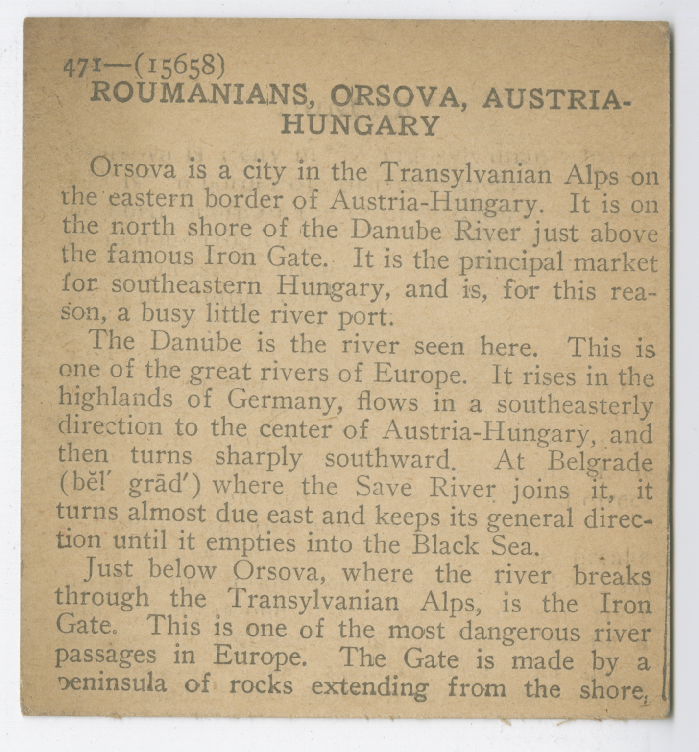 Orsova is a city in the Transylvanian Alps on the eastern border of Austria-Hungary. It is on the north shore of the Danube River just above the famous Iron Gate. It is the principal market for southeastern Hungary, and is, for this reason, a busy little river port. The Danube is the river seen here. This is one of the great rivers of Europe. It rises in the highlands of Germany, flows in a southeasternly direction to the center of Austria-Hungary, and then turns sharply southward. At Belgrade where the Save River joins it, it turns almost due east and keeps its general direction until it empties into the Black Sea. Just below Orsova, where the river breaks through the Transylvanian Alps, is the Iron Gate. This is one of the most dangerous river passages in Europe. The Gate is made by a peninsula of rocks extending from the shore