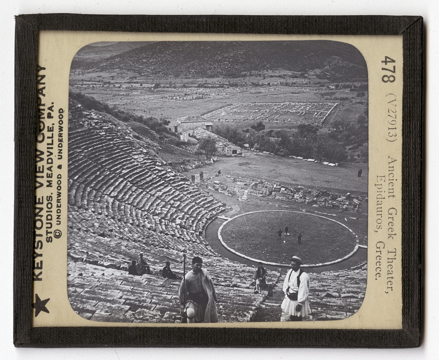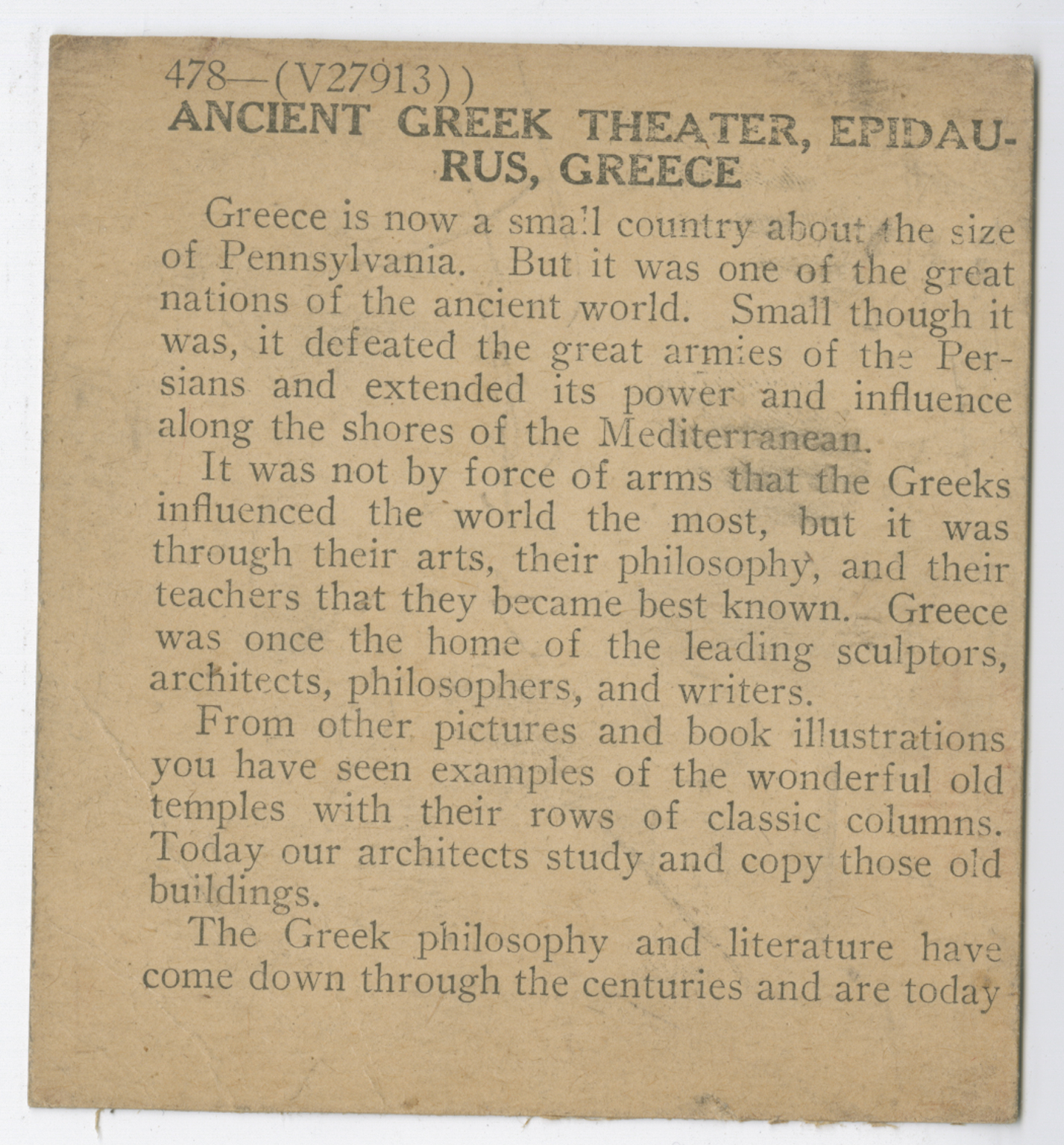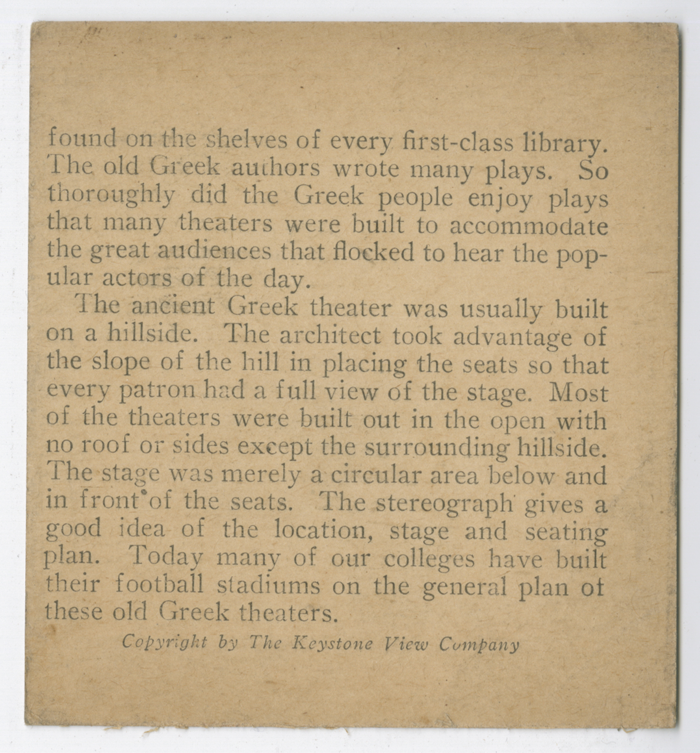 found on the shelves of every first-class library. The old Greek authors wrote many plays. So thoroughly did the Greek people enjoy plays that many theaters were built to accomodate the great audiences that flocked to hear the popular actors of the day. The ancient Greek theater was usually built on a hillside. The architect took advantage of the slope of the hill in placing the seats so that every patron had a full view of the stage. Most of the theaters were built out in the open with no roof or sides except the surrounding hillside. The stage was merely a circular area below and in front of the seats. The stereograph gives a good idea of the location, stage and seating plan. Today many of our colleges have built their football stadiums on the general plan of these old Greek theaters.
