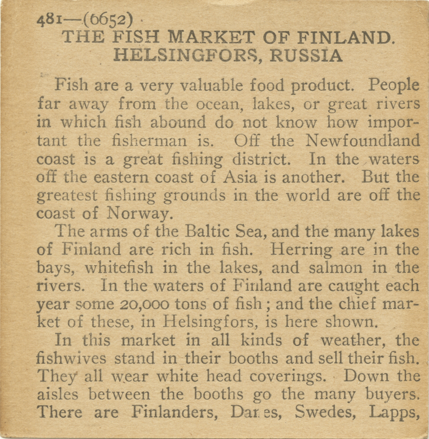 Fish are a very valuable food product. People far away from the ocean, lakes, or great rivers in which fish abound do not know how important the fisherman is. Off the Newfoundland coast is a great fishing district. In the waters off the eastern coast of Asia is another. But the greatest fishing grounds in the world are off the coast of Norway. The arms of the Baltic Sea, and the many lakes of Finland are rich in fish. Herring are in the bays, whitefish in the lakes, and salmon in the rivers. In the waters of Finland are rich in fish. Herring are in the bays, whitefish in the lakes, and salmon in the rivers. In the waters of Finland are caught each year some 20,000 tons of fish; and the chief market of these, in Helsingfors, is here shown. In this market in all kinds of weather, the fishwives stand in their booths and sell their fish. They all wear white head coverings. Down the aisles between the booths go the many buyers. There are Finlanders, Danes, Swedes, Lapps,