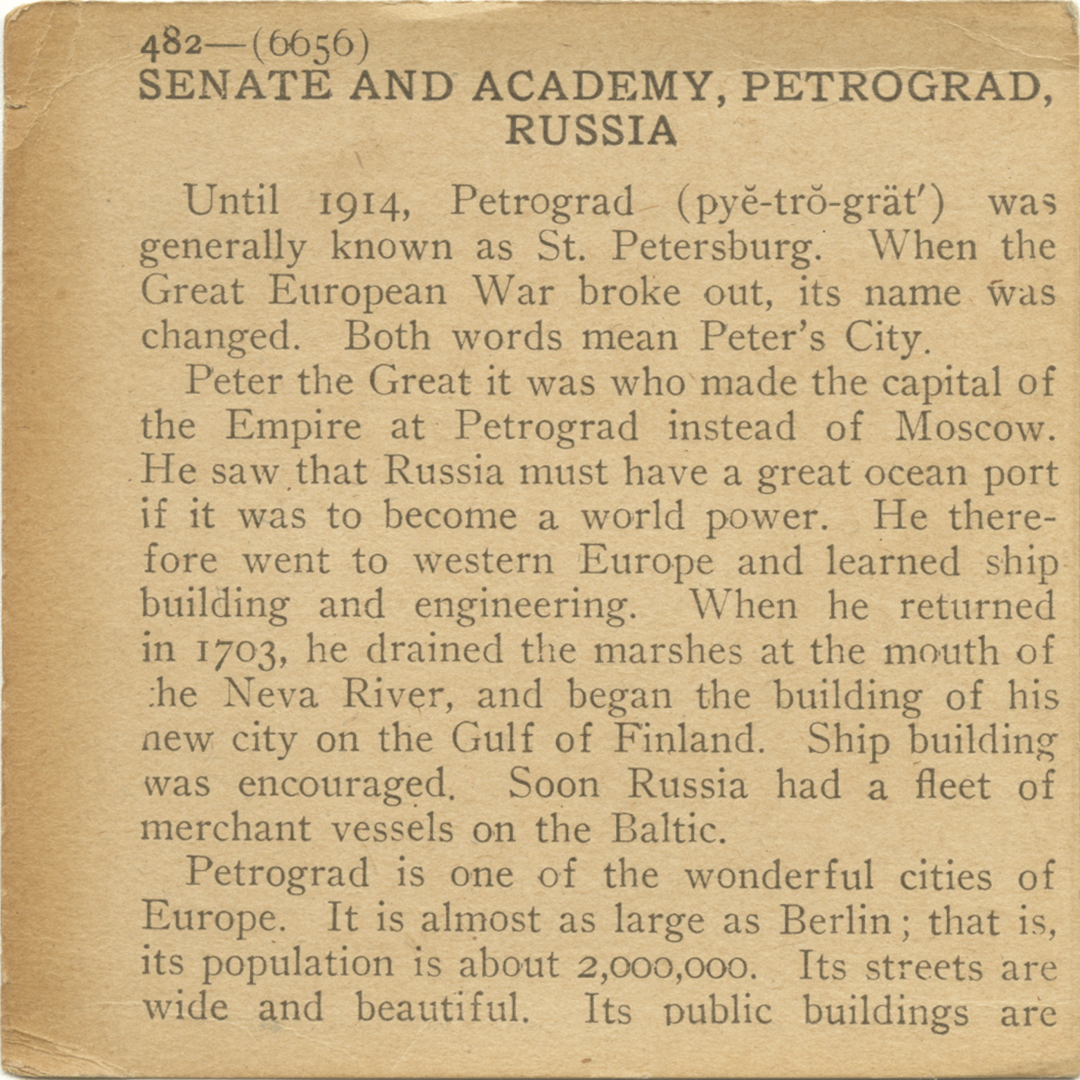 Until 1914, Petrograd was generally known as St. Petersburg. When the Great European War broke out, its name was changed. Both words mean Peter's City. Peter the Great it was who made the capital of the Empire at Petrograd instead of Moscow. He saw that Russia must have a great ocean port if it was to become a world power. He therefore went to western Europe and learned ship building and engineering. When he returned in 1703, he drained the marshes at the mouth of the Neva River, and began the building of his new city on the Gulf of Finland. Ship building was encouraged. Soon Russia had a fleet of merchant vessels on the Baltic. Petrograd is one of the wonderful cities of Europe. It is almost as large as Berlin; that is, its population is about 2,000,000. Its public buildings are