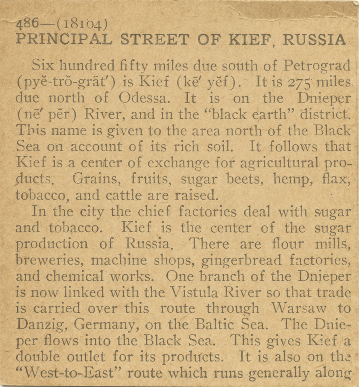 Six hundred fifty miles due south of Petrograd is Kief. It is 275 miles due north of Odessa. It is on the Dnieper River, and in the "black earth" district. This name is given to the area north of the Black Sea on account of its rich soil. It follows that Kief is a center of exchange for agriculture products. Grains, fruits, sugar beets, hemp, flax, tobacco, and cattle are raised. In the city the chief factories deal with sugar and tobacco. Kief is the center of the sugar production of Russia. There are flour mills, breweries, machine shops, gingerbread factories, and chemical works. One branch of the Dnieper is now linked with the Vistula River so that trade is carried over this route through Warsaw to Danzig, Germany, on the Baltic Sea. The Dnieper flows into the Black Sea. This gives Kief a double outlet for its products. It is also on the "West-to-East" route which runs generally along