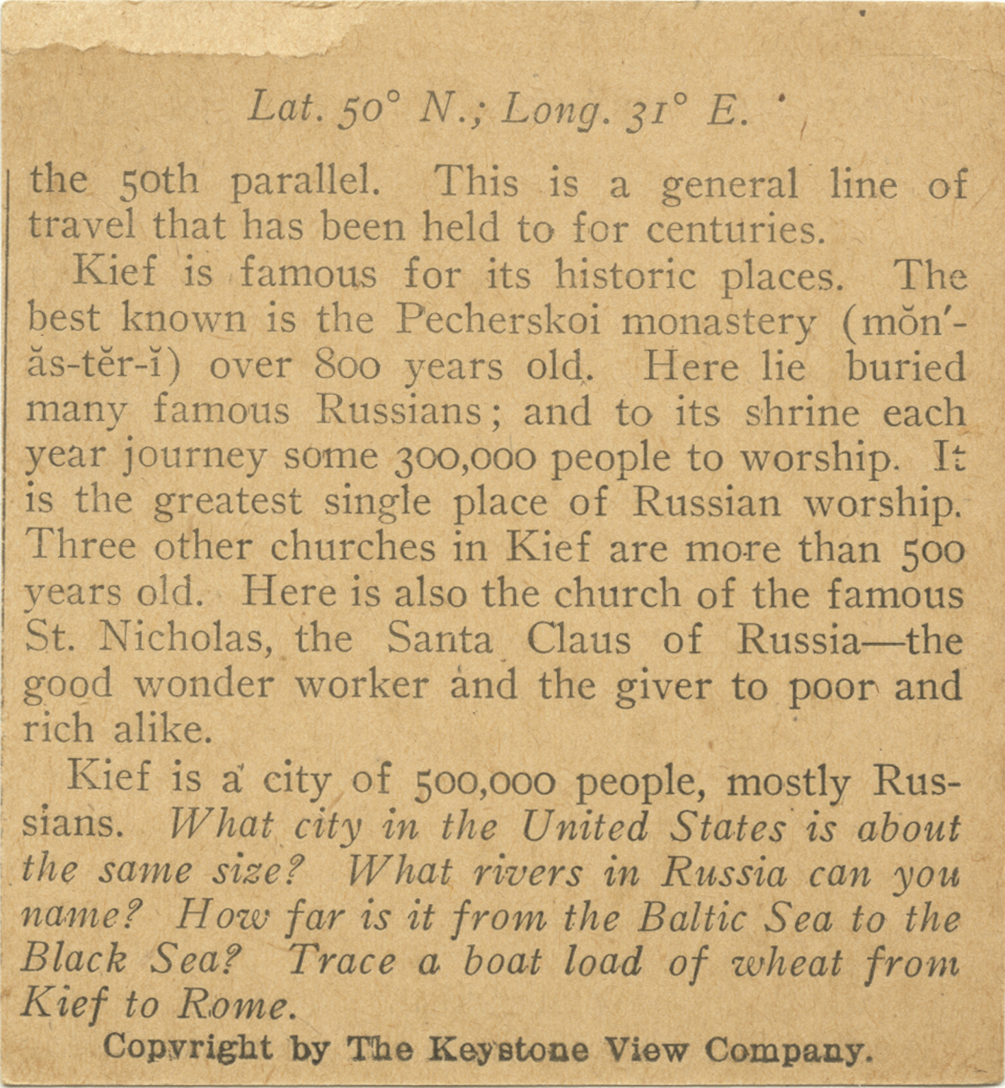 the 50th parallel. This is a general line of travel that has been held to for centuries. Kief is famous for its historic places. The best known is the Pecherskoi monastery over 800 years old. Here lie buried many famous Russians; and to its shrine each year journey some 300,000 people to worship. It is the greatest single place of Russian worship. Three other churches in Kief are more than 500 years old. Here is also the church of the famous St. Nicholas, the Santa Claus of Russia - the good wonder worker and the giver to poor and rich alike. Kief is a city of 500,000 people, mostly Russians. What city in the United States is about the same size? What rivers in Russia can you name? How far is it from the Baltic Sea to the Black Sea? Trace a boat load of wheat from Kief to Rome.
