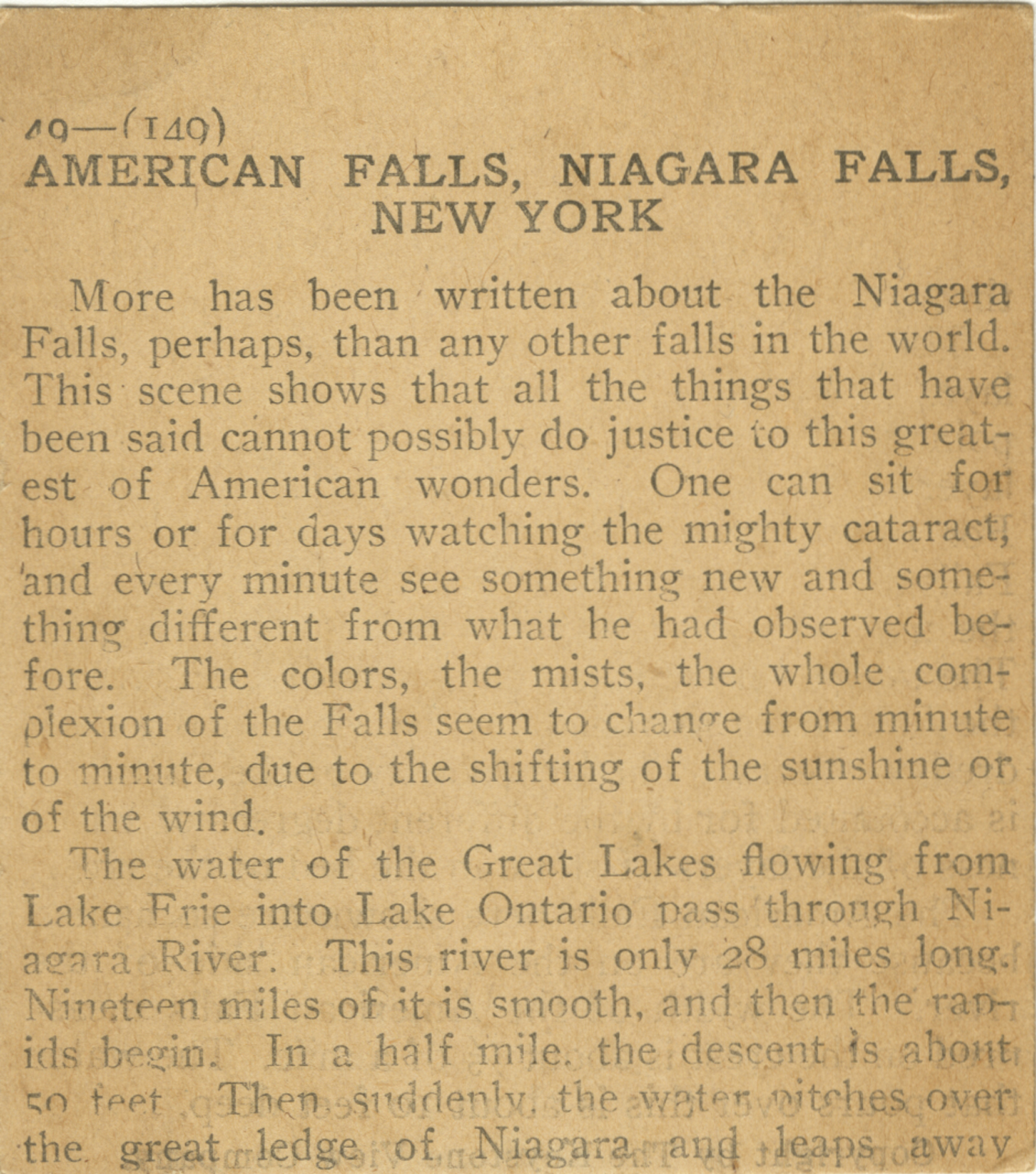 More has been written about Niagara Falls, perhaps, than any other falls in the world. This scene shows that all the things that have been said cannot possibly do justice to this greatest of American wonders. One can sit for hours or for days watching the mighty cataract, and every minute see something new and something different from what he had observed before. The colors, the mists, the whole complexion of the Falls seem to change from minute to minute, due to the shifting of the sunshine or of the wind. The water of the Great Lakes flowing from Lake Erie into Lake Ontario pass through Niagara River. This river is only 28 miles long. Nineteen miles of it is smooth, and then the rapids begin. In a half mile the descent is about 50 feet. Then suddenly the water pitches over the great ledge of Niagara and leaps away