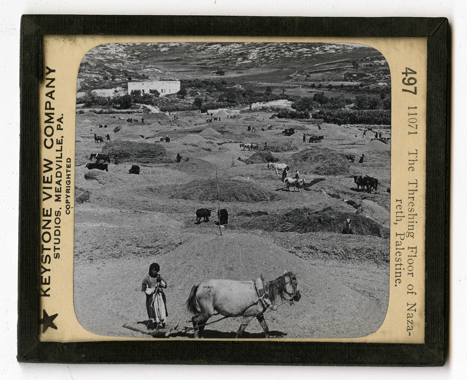 Nazareth is a small city lying about half way between the Sea of Galilee and the Mediteranean. Just outside the city is a level stretch of land. This is used by the pilgrims as a camping place. But it serves a more useful purpose to the native Nazerenes. The flat ground is covered with clay. This clay is rolled and worked until it is hard and smooth. Here during the harvest time come the farmers of nearby districts with their loads of grain. This is in the form of sheaves. The sheaves are spread out on the smooth surface, and the grain is trodden out under the feet of horses or oxen. Drags are also hitched behind a horse or a team, and these are pulled over the straw until the grain is set free from the hulls. In the picture the girl in the foreground has a great pile of grain and chaff, which is being thrashed with the drag that you see. Observe