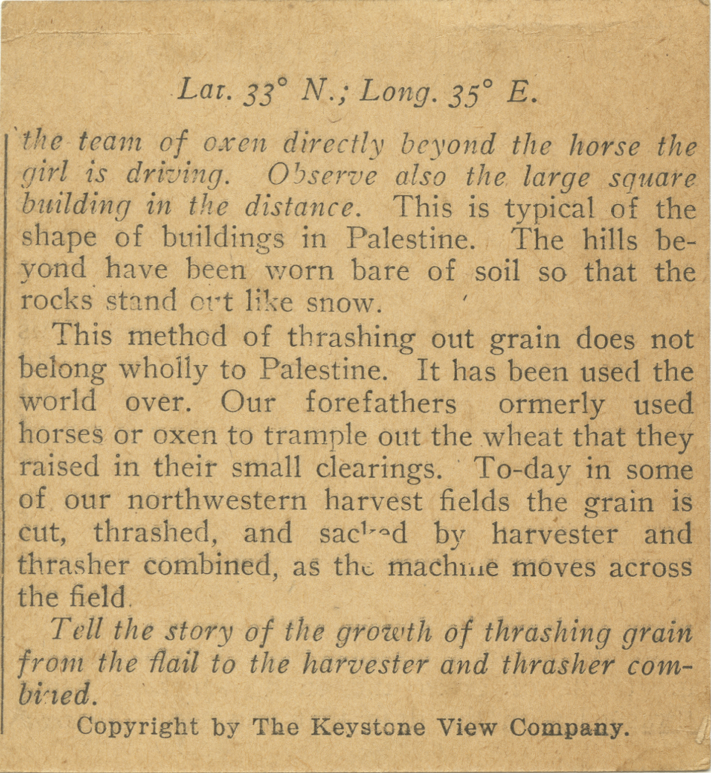 the team of oxen directly beyond the horse the girl is driving. Observe also the large square building in the distance. This is typical of the shape of buildings in Palestine. The hills beyond have been worn bare of soil so that the rocks stand out like snow. This method of thrashing out grain does not belong wholly to Palestine. It has been used the world over. Our forefathers formerly used horses or oxen to trample out the wheat that they raised in their small clearings. To-day in some of our northwestern harvest fields the grain is cut, thrashed, and sacked by harvester and thrasher combined, as the machine moves across the field. Tell the story of the growth of thrashing grain from the flail to the harvester and thrasher combined.
