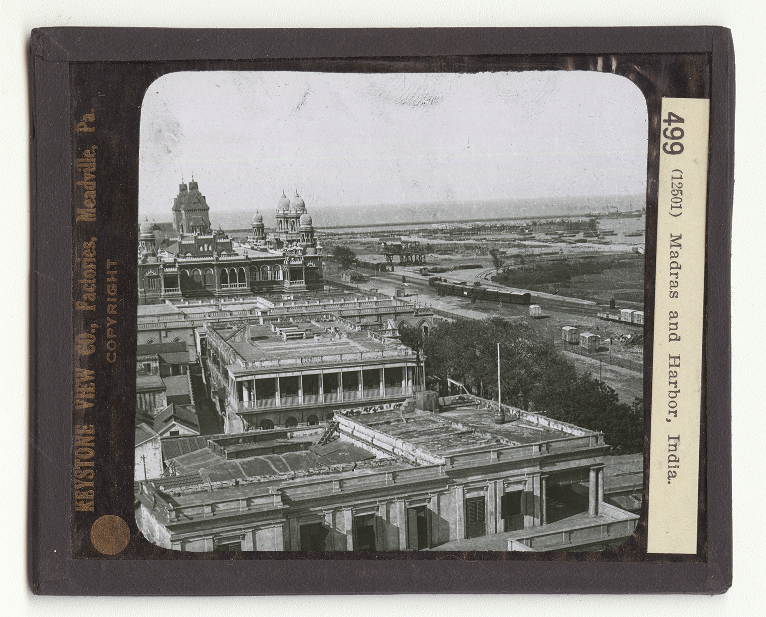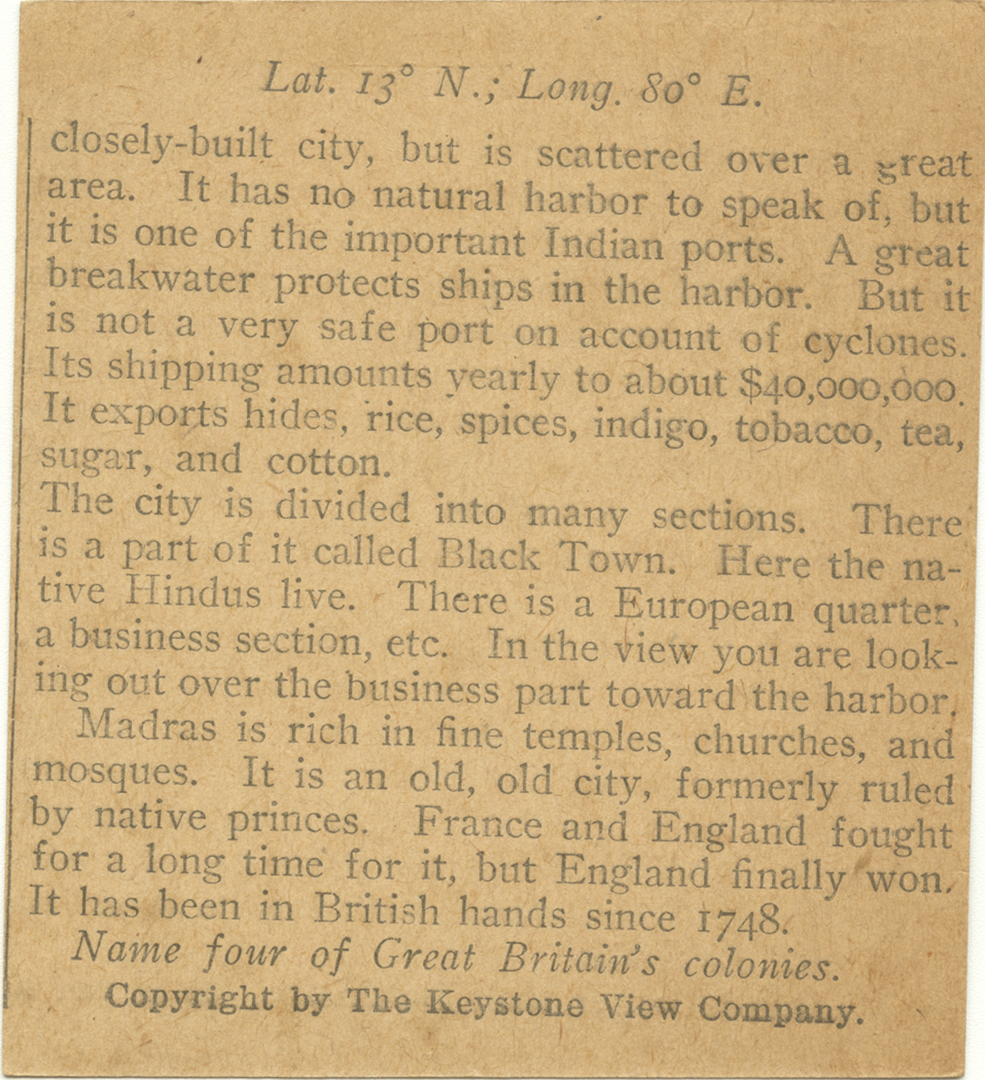 closely-built city, but is scattered over a great area. It has no natural harbor to speak of, but it is one of the important Indian ports. A great breakwater protects ships in the harbor. But it is not a very safe port on account of cyclones. Its shipping amounts yearly to about $40,000,000. It exports hides, rice, spices, indigo, tobacco, tea, sugar, and cotton. The city is divided into many sections. There is a part of it called Black Town. Here the native Hindus live. There is a European quarter, a business section, etc. In the view you are looking out over the business part toward the harbor. Madras is rich in fine temples, churches, and mosques. It is an old, old city, formerly ruled by native princes. France and England fought for a long time for it, but England finally won. It has been in British hands since 1748. Name four of Great Britain's colonies.
