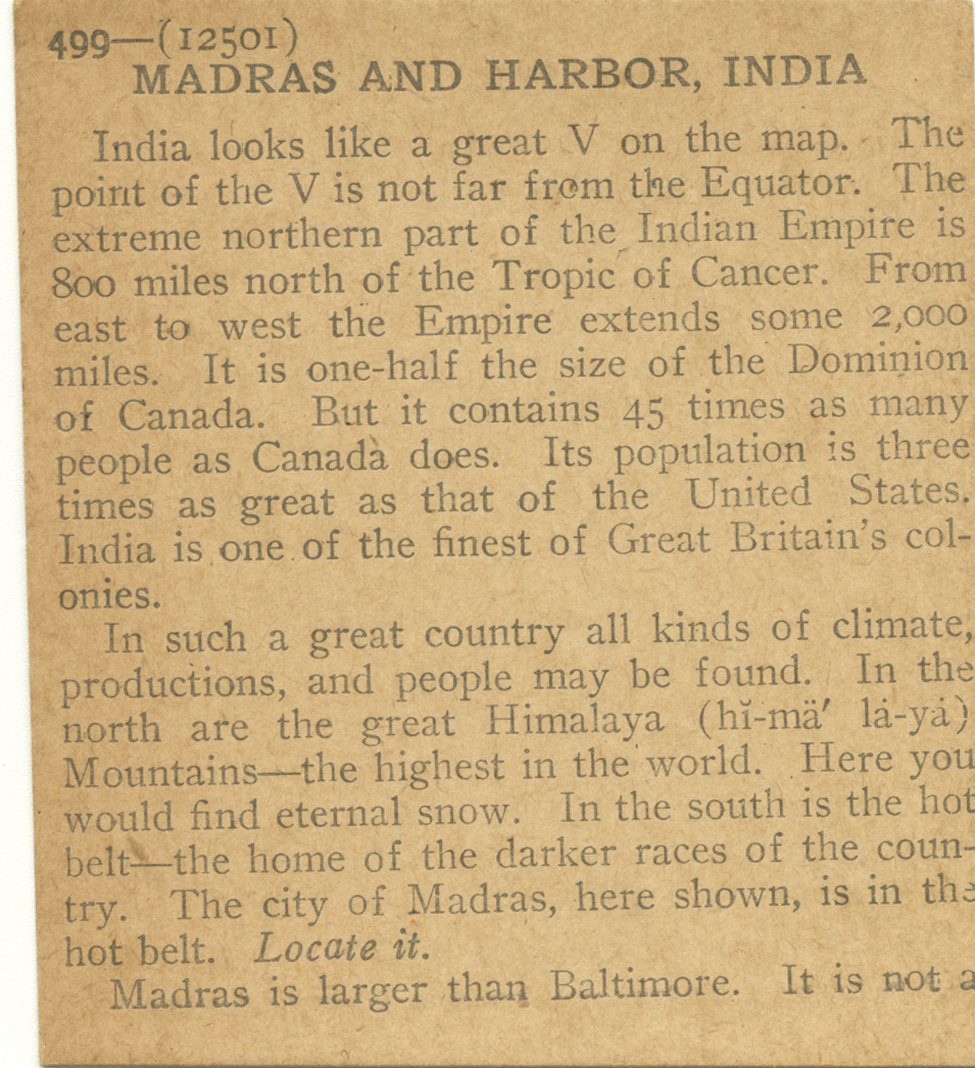 India looks like a great V on the map. The point of the V is not far from the Equator. The extreme northern part of the Indian Empire is 800 miles north of the Tropic of Cancer. From east to west the Empire extends some 2,000 miles. It is one-half the size of the Dominion of Canada. But it contains 45 times as many people as Canada does. Its population is three times as great as that of the United States. India is one of the finest of Great Britain's colonies. In such a great country all kinds of climate, productions, and people may be found. In the north are the great Himalaya Mountains - the highest in the world. Here you would find eternal snow. In the south is the hotbelt - the home of the darker races of the country. The city of Madras, here shown, is in the hot belt. Locate it. Madras is larger than Baltimore. It is not a