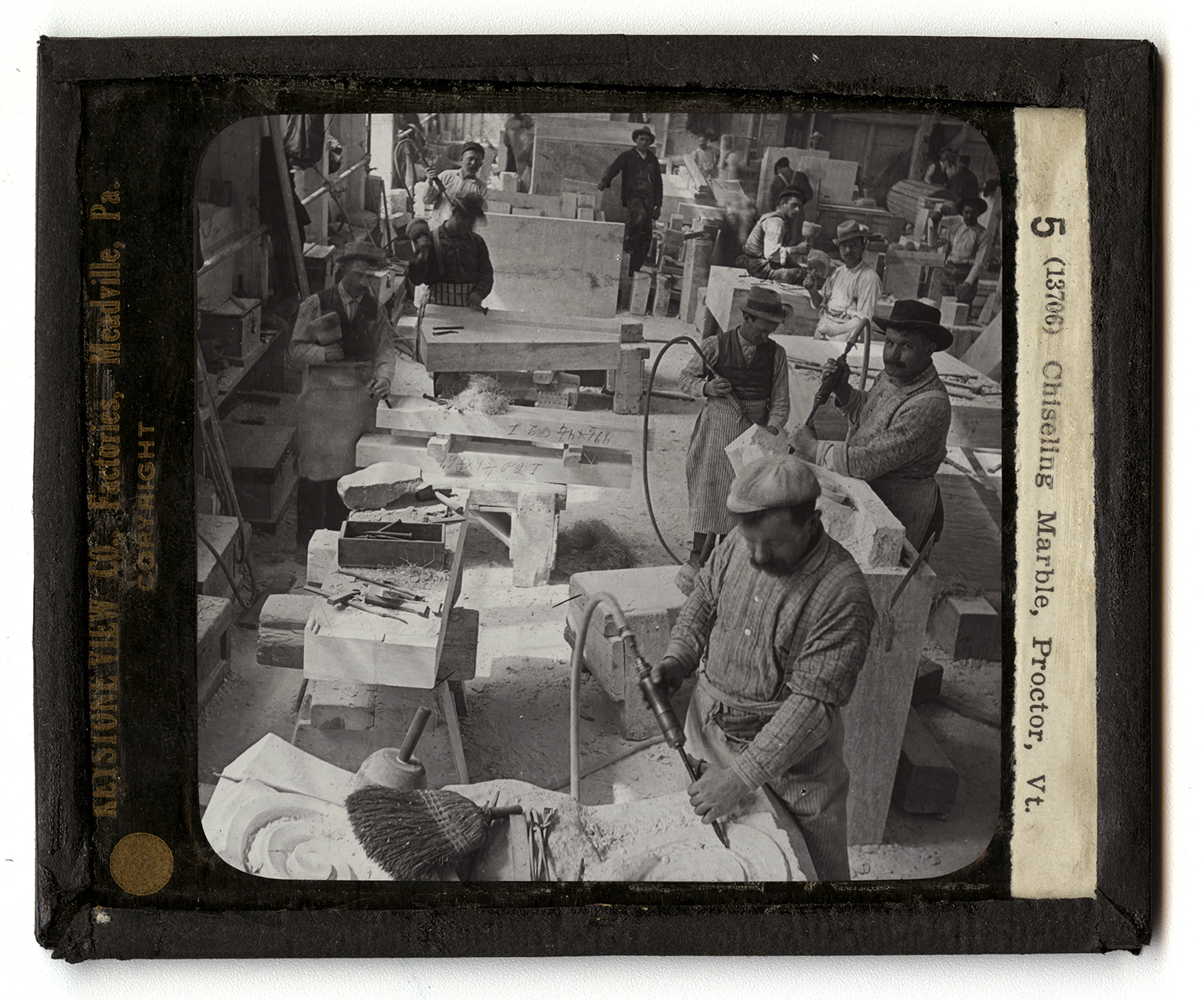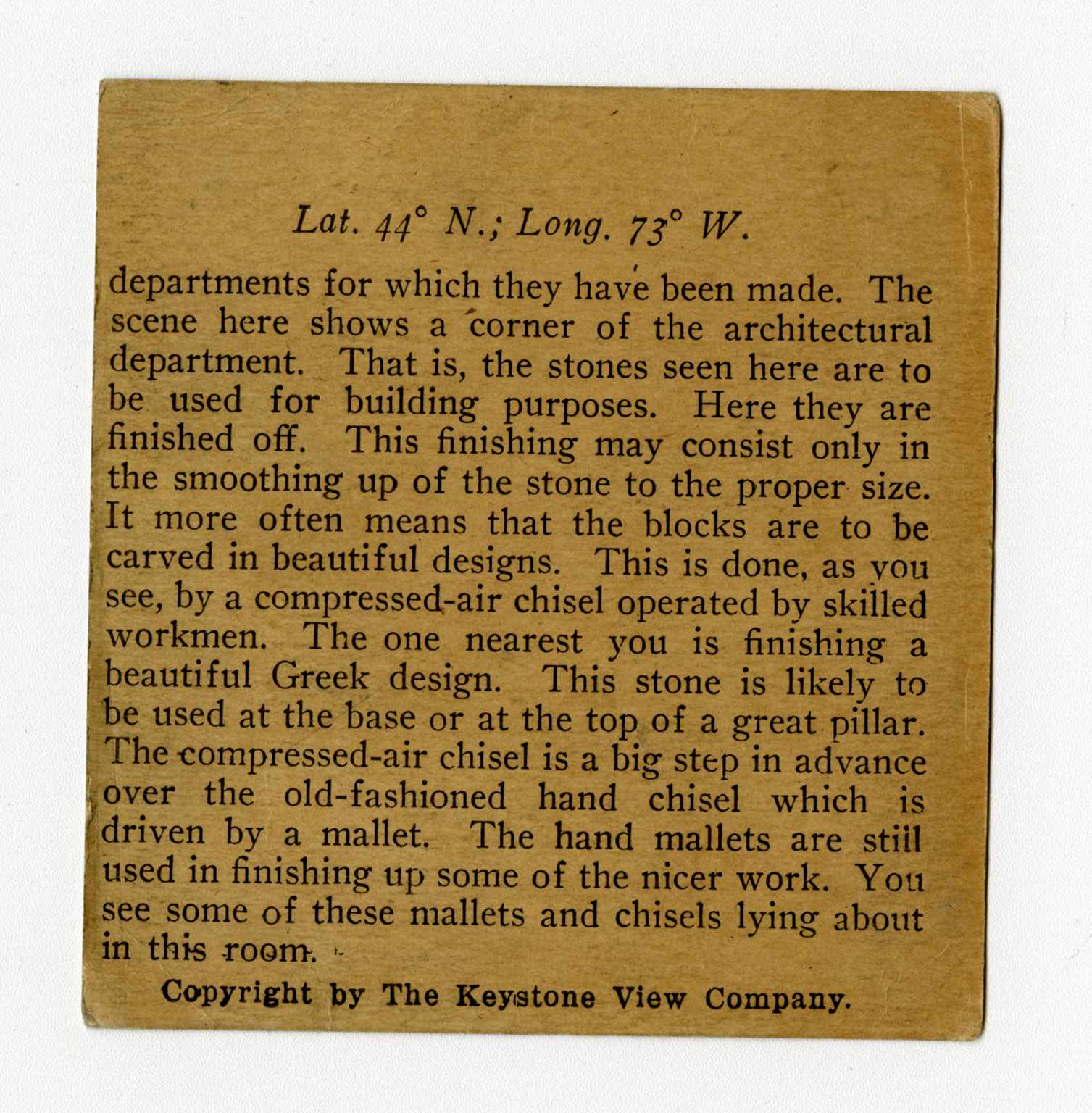 departments for which they have been made. The scene here shows a corner of the architectural department. That is, the stones seen here are to be used for building purposes. Here they are finished off. This finishing may consist only in the smoothing up of the stone to the proper size. It more often means that the blocks are to be carved in beautiful designs. This is done, as you see, by a compressed-air chisel operated by skilled workmen. The one nearest you is finishing a beautiful Greek design. This stone is likely to be used at the base or at the top of a great pillar. The compressed-air chisel is a big step in advance over the old-fashioned hand chisel which is driven by a mallet. The hand mallets are still used in finishing up some of the nicer work. You see some of these mallets and chisels lying about this room.
