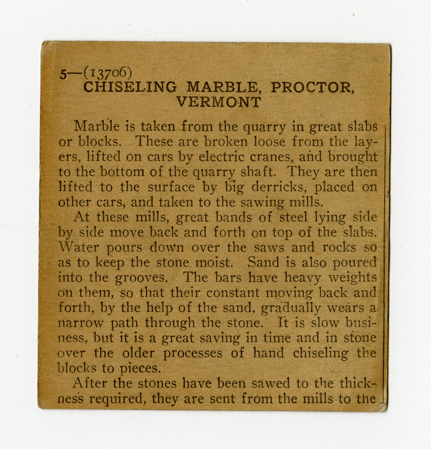Marble is taken from the quarry in great slabs or blocks. These are broken loose from the layers, lifted on cars by electric cranes, and brought to the bottom of the quarry shaft. They are then lifted to the surface by big derricks, placed on other cars, and taken to the sawing mills. At these mills, great bands of steel lying side by side move back and forth on top of the slabs. Water pours down over the saws and rocks so as to keep the stone moist. Sand is also poured into the grooves. The bars have heavy weights on them, so that their constant moving back and forth, by the help of the sand, gradually wears a narrow path through the stone. It is slow business, but it is a great saving in time and in stone over the older processes of hand chiseling the blocks to pieces. After the stones have been sawed to the thickness required, they are sent from the mills to the