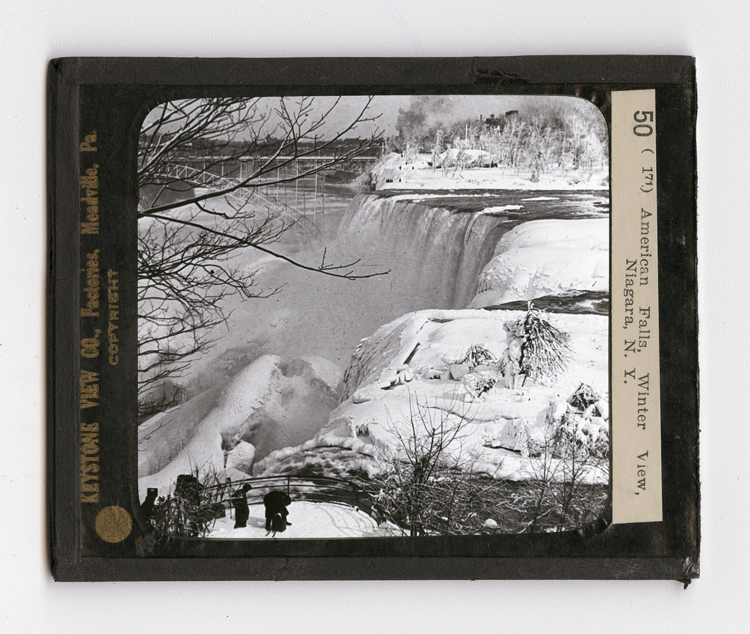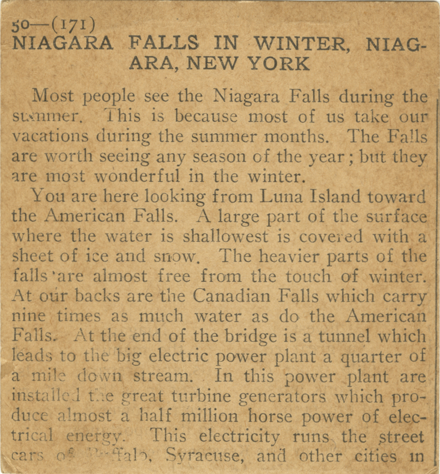 Most people see Niagara Falls during the summer. This is because most of us take our vacations during the summer months. The Falls are worth seeing any season of the year; but they are most wonderful in the winter. You are here looking from Luna Island toward the American Falls. A large part of the surface where the water is shallowest is covered with a sheet of ice and snow. The heavier parts of the falls are almost free from the touch of winter. At our backs are the Canadian Falls which carry nine times as much water as do the American Falls. At the end of the bridge is a tunnel which leads to the big electric power plant a quarter of a mile down stream. In this power plant are installed the great turbine generators which produce almost half a million horse power of electrical energy. This electricity runs the street cars of Buffalo, Syracuse, and other cities in