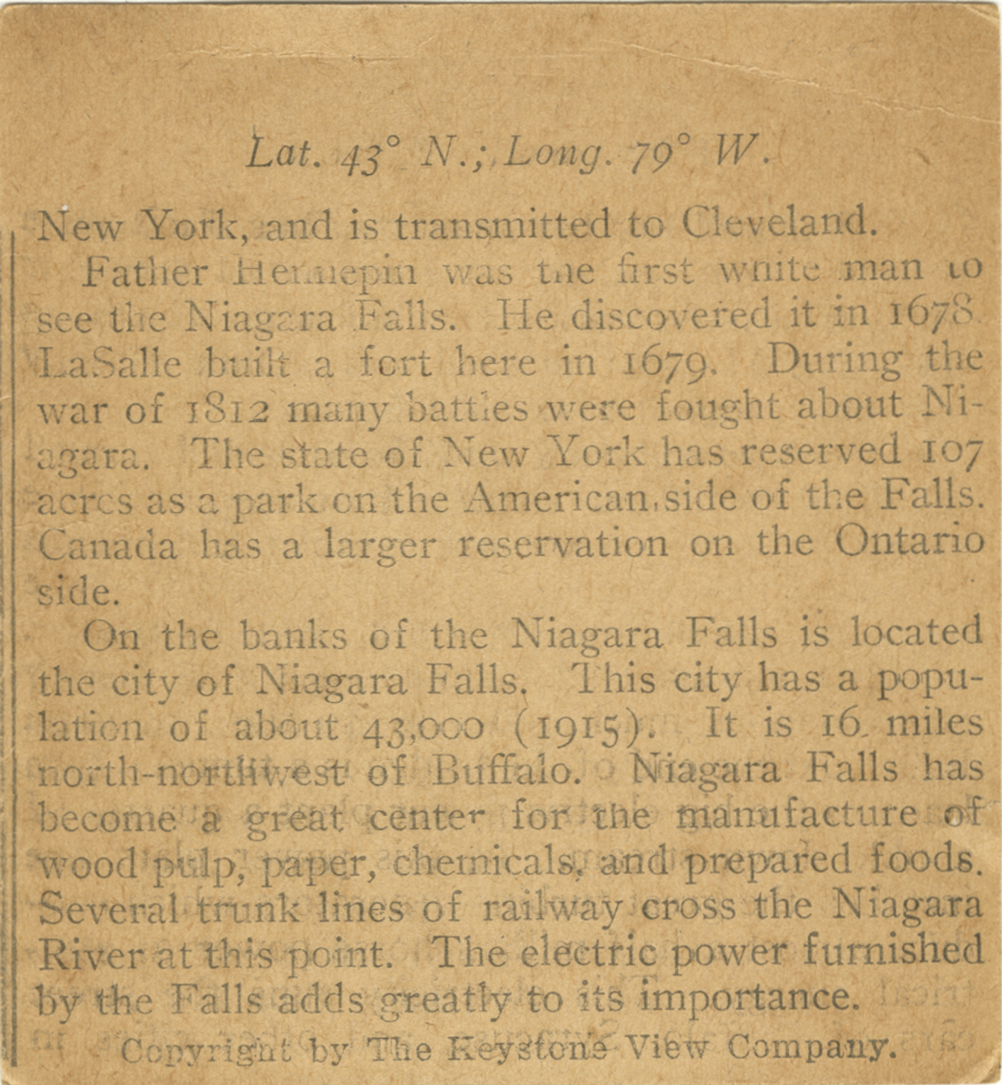 New York, and is transmitted to Cleveland. Father Hennepin was the first white man to see the Niagara Falls. He discovered it in 1678. LaSalle built a fort here in 1679. During the war of 1812 many battles were fought about Niagara. The state of New York has reserved 107 acres as a park on the American side of the Falls. Canada has a larger reservation on the Ontario side. On the banks of the Niagara Falls is located the city of Niagara Falls. This city has a population of about 43,000 (1915). It is 16 miles north-northwest of Buffalo. Niagara Falls has become a great center for the manufacture of wood pulp, paper, chemicals, and prepared foods. Several trunk lines of railway cross Niagara River at this point. The electric power furnished by the Falls adds greatly to its importance.