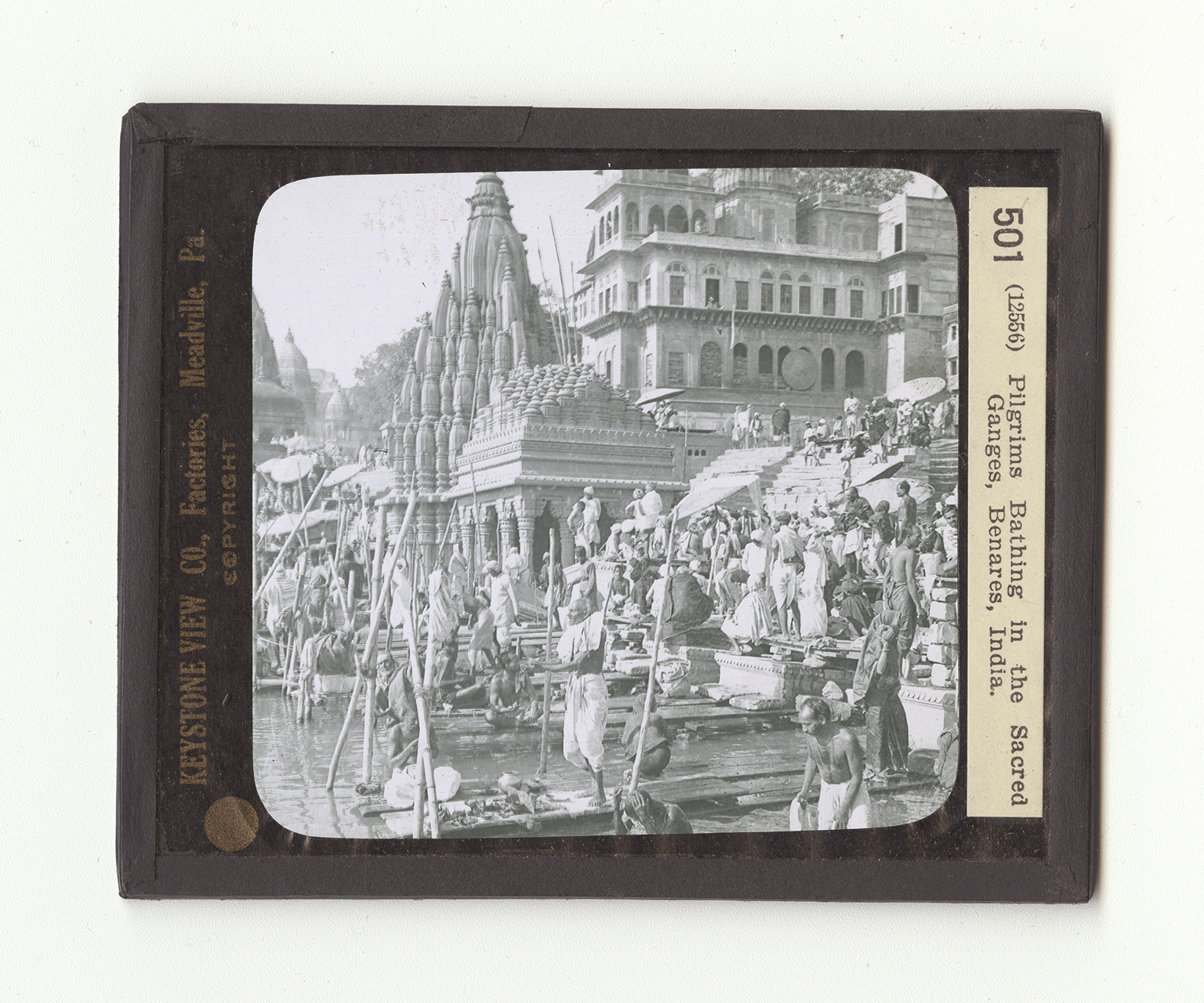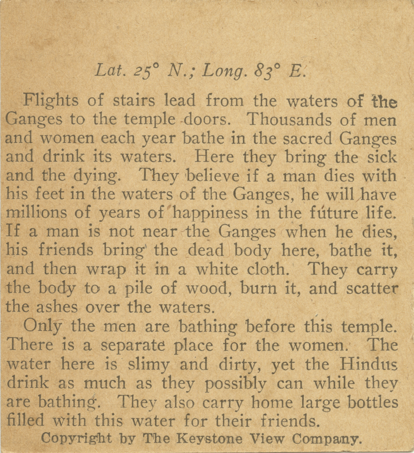 Flights of stairs lead from waters of the Ganges to the temple doors. Thousands of men and women each year bathe in the sacred Ganges and drink its waters. Here they bring the sick and the dying. They believe if a man dies with his feet in the waters of the Ganges, he will have millions of years of happiness in the future life. If a man is not near the Ganges when he dies, his friends bring the dead body here, bathe it, and then wrap it in a white cloth. They carry the body to a pile of wood, burn it, and scatter the ashes over the waters. Only the men are bathing before this temple. There is a separate place for the women. The water here is slimy and dirty, yet the Hindus drink as much as they possibly can while they are bathing. They also carry home large bottles filled with this water for their friends.