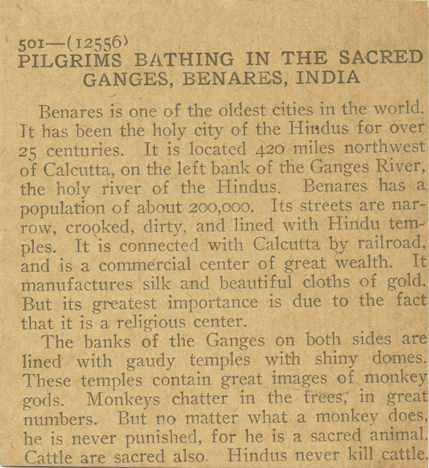 Benares is one of the oldest cities in the world. It has been the holy city of the Hindus for over 25 centuries. It is located 420 miles northwest of Calcutta, on the left bank of the Ganges River, the holy river of the Hindus. Benares has a population of about 200,000. Its streets are narrow, crooked, dirty, and lined with Hindu temples. It is connected with Calcutta by railroad, and is commercial center of great wealth. It manufactures silk and beautiful cloths of gold. But its greatest importance is sue to the fact that it is a religious center. The banks of the Ganges on both sides are lined with gaudy temples with shiny domes. These temples contain great images of monkey gods. Monkeys chatter in the trees, in great numbers. But no matter what a monkey does, he is never punished, for he is a sacred animal. Cattle are sacred also. Hindus never kill cattle