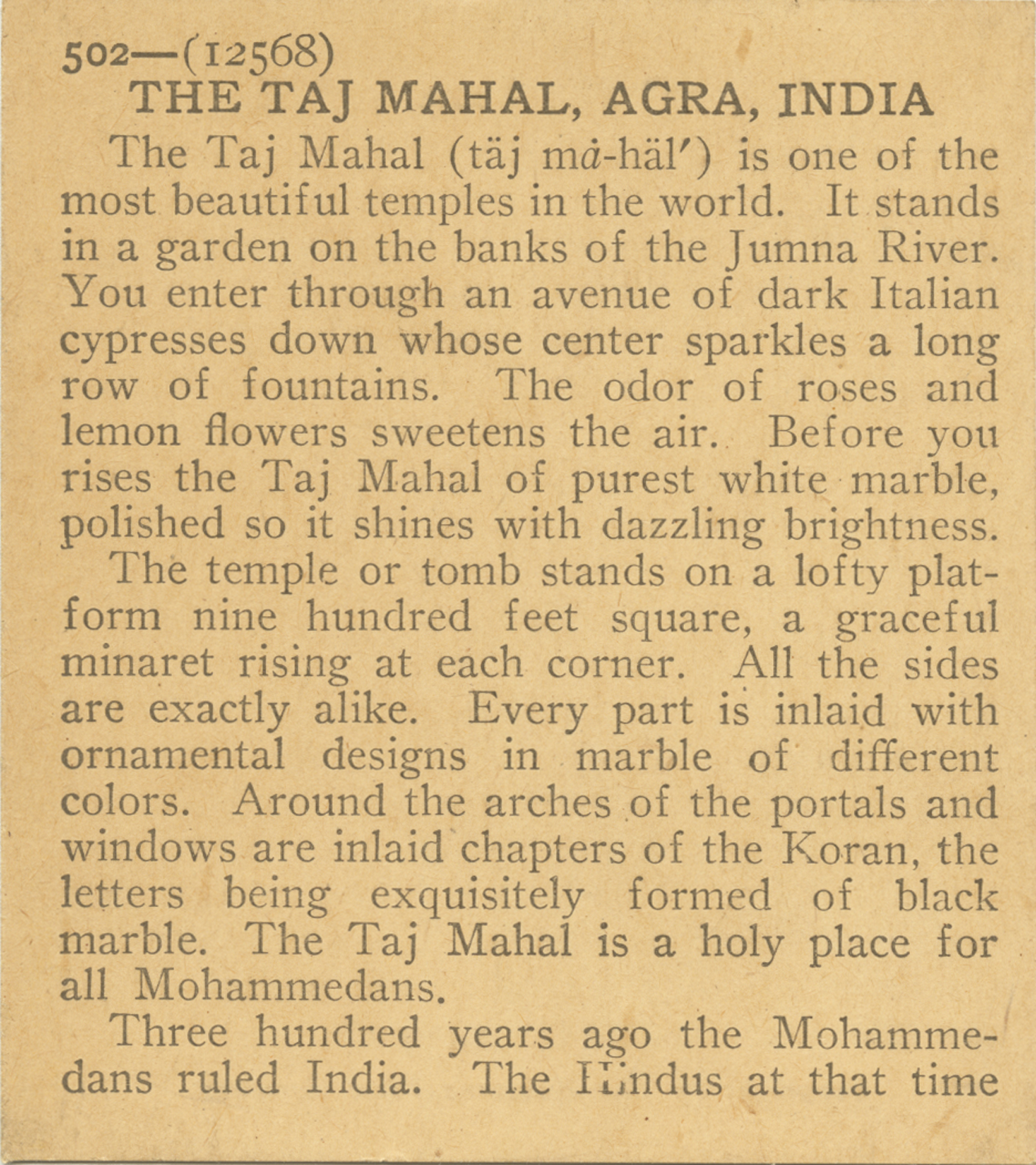 The Taj Mahal is one of the most beautiful temples in the world. It stands in a garden on the banks of the Jumna River. You enter through an avenue of dark Italian cypresses down whose center sparkles a long row of fountains. The odor of roses and lemon flowers sweetens the air. Before you rise the Taj Mahal of purest white marble, polished so it shines with dazzling brightness. The temple or tomb stands on a lofty platform nine hundred feet square, a graceful minaret rising at each corner. All the sides are exactly alike. Every part is inlaid with ornamental designs in marble of different colors. Around the arches of the portals and windows are inlaid chapters of the Koran, the letters being exquisitely formed of black marble. The Taj Mahal is a holy place for all Mohammedans. Three hundred years ago the Mohammedans ruled India. The Hindus at that time