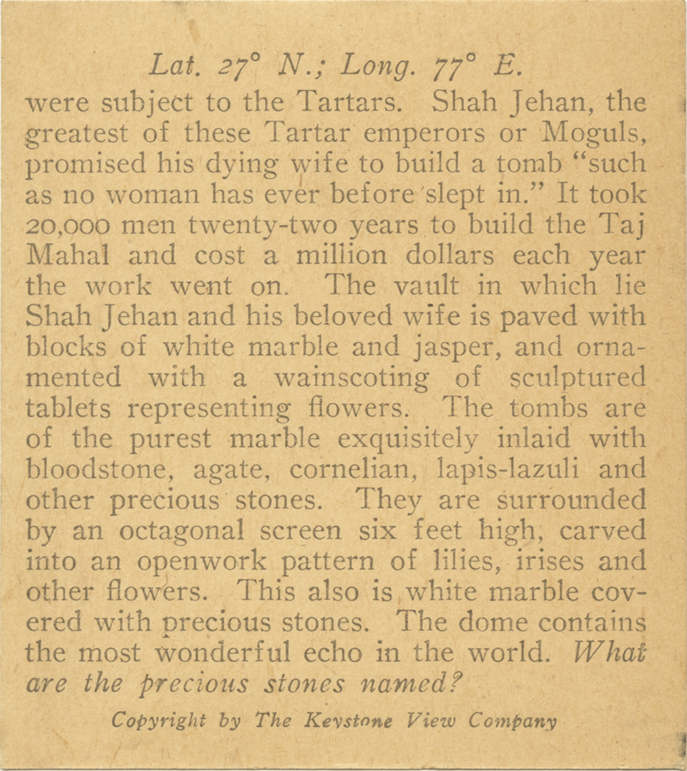 were subject to the Tartars. Shah Jehan, the greatest of these Tartar emperors or Moguls, promised his dying wife to build a tomb "such as no woman has ever before slept in." It took 20,000 men twenty-two years to build the Taj Mahal and cost a million dollars each year the work went on. The vault in which lie Shah Jehan and his beloved wife is paved with blocks of white marble and jasper, and ornamented with a wainscoting of scupltured tablets representing flowers. The tombs are of the purest marble exquisitely inlaid with bloodstone, agate, cornelian, lapis-lazuli, and other precious stones. They are surrounded by an octagonal screen six feet high, carved into an openwork pattern of lillies, irises and other flowers. This also is white marble covered with precious stones. The dome contains the most wonderful echo in the world. What are the precious stones named?