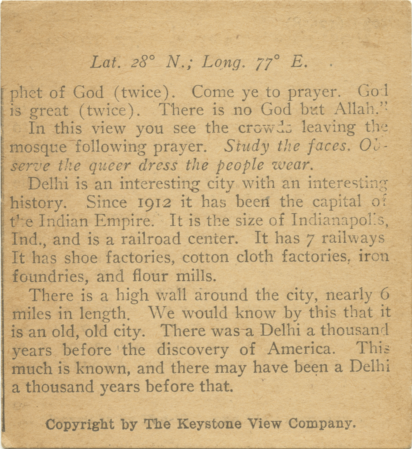 phet of God (twice). Come ye to prayer. God is great (twice). There is no God but Allah," In this view you see the crowds leaving the mosque following prayer. Study the faces. Observe the queer dress the people wear. Dehli is an interesting city with an interesting history. Since 1912 it has been the capital of the Indian Empire. It is the size of Indianapolis, Ind., and is a railroad center. It has 7 railways. It has shoe factories, cotton cloth factories, iron foundries, and flour mills. There is a high wall around the city, nearly 6 miles in lenght. We would know by this that it is an old, old city. There was a Dehli a thousand years before the discovery of America. This much is known, and there may have been a Dehli a thousand years before that.