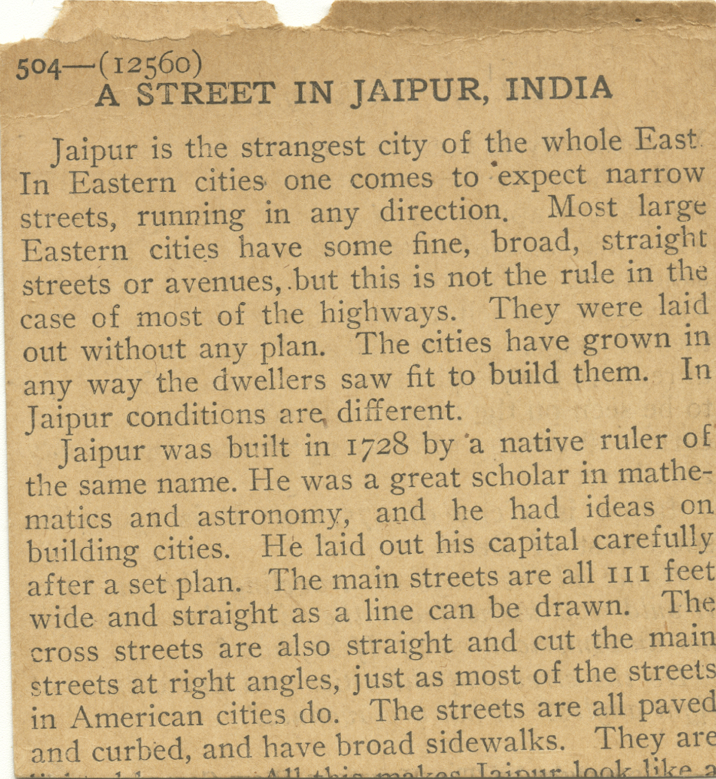 Jaipur is the strangest city of the whole East. In Eastern cities one comes to expect narrow streets, running in any direction. Most large Eastern cities have some fine, broad, straight streets or avenues, but this is not the rule in the case of most of the highways. They were laid out without any plan. The cities have grown in any way the dwellers saw fit to build them. In Jaipur conditions are different. Jaipur was built in 1728 by a native ruler of the same name. He was a great scholar in mathematics and astronomy, and he had ideas on building cities. He laid out his capital carefully after a set plan. The main streets are all 111 feet wide and straight as a line can be drawn. The cross streets are also straight and cut the main streets in American cities do. The streets are all paved in American cities do. The streets are all paved and curbed and have broad sidewalks. They are lighted by gas. All this makes Jaipur look like a