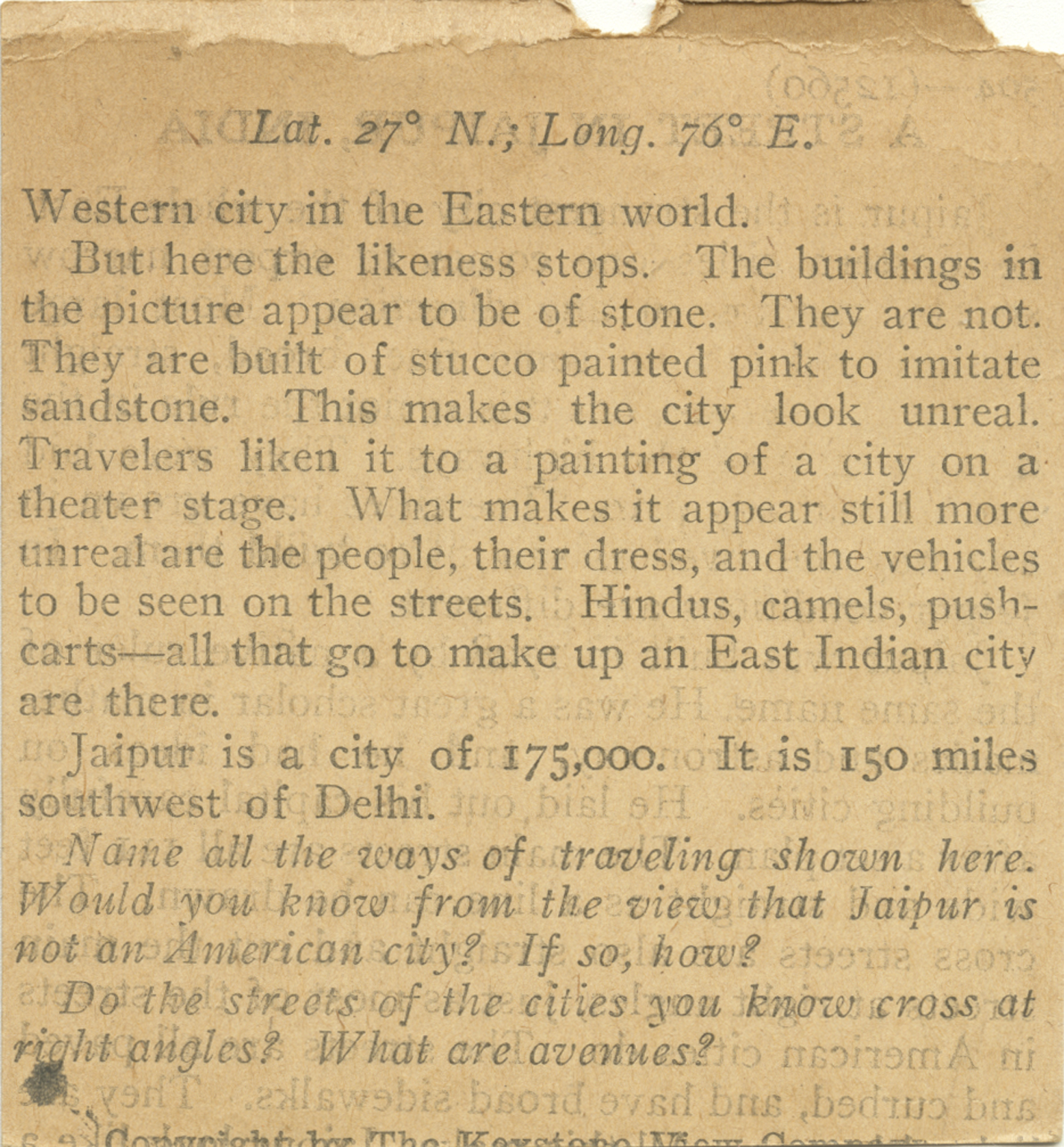 Western citiy in the Eastern world. But here the likeness stops. The buildings in the picture appear to be of stone. They are not. They are built of stucco painted pink to imitate sandstone. This makes the city look unreal. Travelers liken it to a painting of a city on a theater stage. What makes it appear still more unreal are the people, their dress, and the vehicles to be seen on the streets. Hindus, camels, pushcarts - all that go to make up an East Indian city are there. Jaiput is a city of 175,000. It is 150 miles southwest of Dehli. Name all the ways of traveling shown here. Would you know from the view that Jaipur is not an American city? If so, how? Do the streets of the cities you know cross at right angles? What are avenues?
