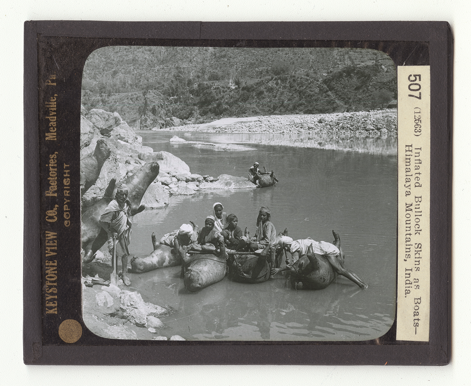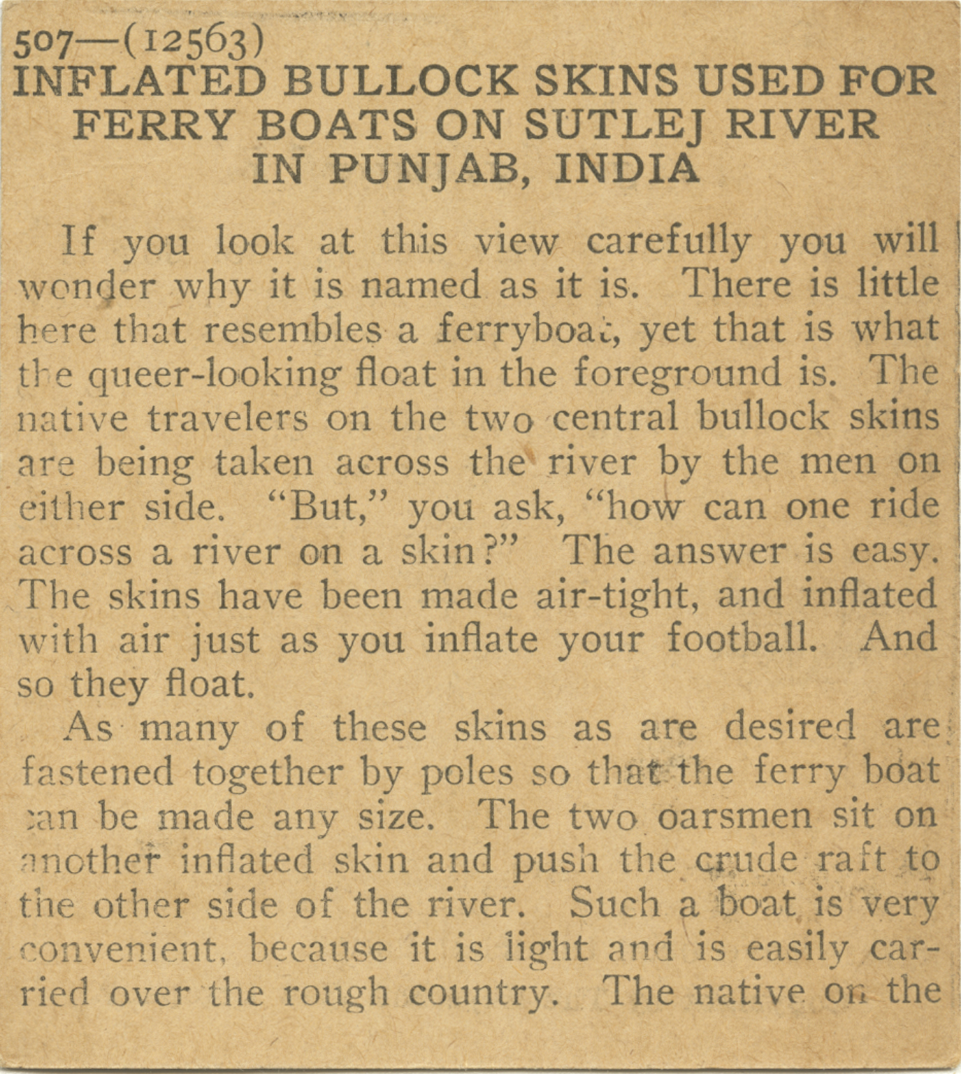 If you look at this view carefully you will wonder why it is named as it is. There is little here that resembles a ferryboat, yet that is what the queer-looking float in the foreground is. The native travelers on the two central bullock skins are being taken across the river by the men on either side. "But," you ask, "how can one ride across a river on a skin?" The answer is easy. The skins have been made air-tight, and inflated with air just as you inflate your football. And so they float. As many of these skins as are desired are fastened together by poles so that the ferry boat can be made any size. The two oarsmen sit on another inflated skin and push the crude raft to the other side of the river. Such a boat is very convenient because it is light and is easily carried over the rough country. The native on the