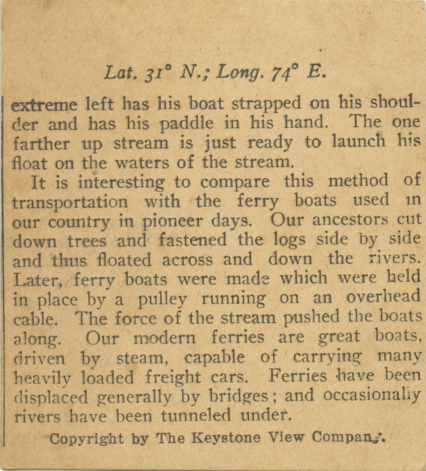 extreme left has his boat strapped on his shoulder and has his paddle in his hand. The one farther up stream is just ready to launch his float on the waters of the stream. It is interesting to compare this method of transportation with the ferry boats used in our country in pioneer days. Our ancestors cut down trees and fastened the logs side by side and thus floated across and down the rivers. Later, ferry boats were made which were held in place by a pulley running on an overhead cable. The force of the stream pushed the boats driven by steam, capable of carrying many heavily loaded freight cars. Ferries have been displaced generally by bridges; and occasionally rivers have been tunneled under.
