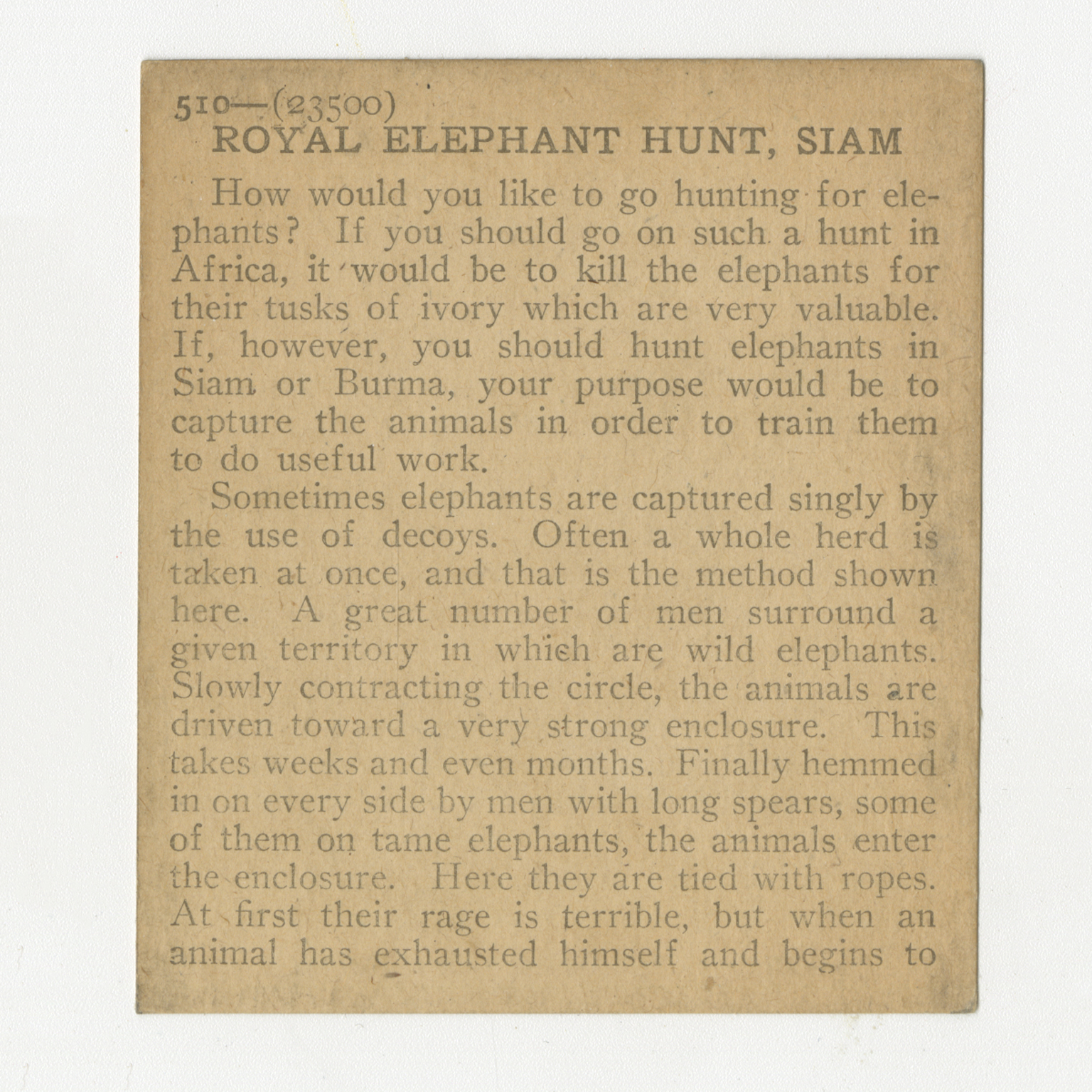 How would you like to go hunting for elephants? If you should go on such a hunt in Africa, it would be to kill the elephants for their tusks of ivory which are very valuable. If, however, you should hunt elephants in Siam or Burma, your purpose would be to capture the animals in order to train them to do useful work. Sometimes elephants are captured singly by the use of decoys. Often a whole herd is taken at once, and that is the method shown here. A great number of men surround a given territory in which are wild elephants. Slowly contracting the circle, the animals are driven toward a very strong enclosure. This takes weeks and even months. Finally hemmed in on every side by men with long spears, some of them on tame elephants, the animals enter the enclosure. Here they are tied with ropes. At first their rage is terrible, but when an animal has exhausted himself and begins to