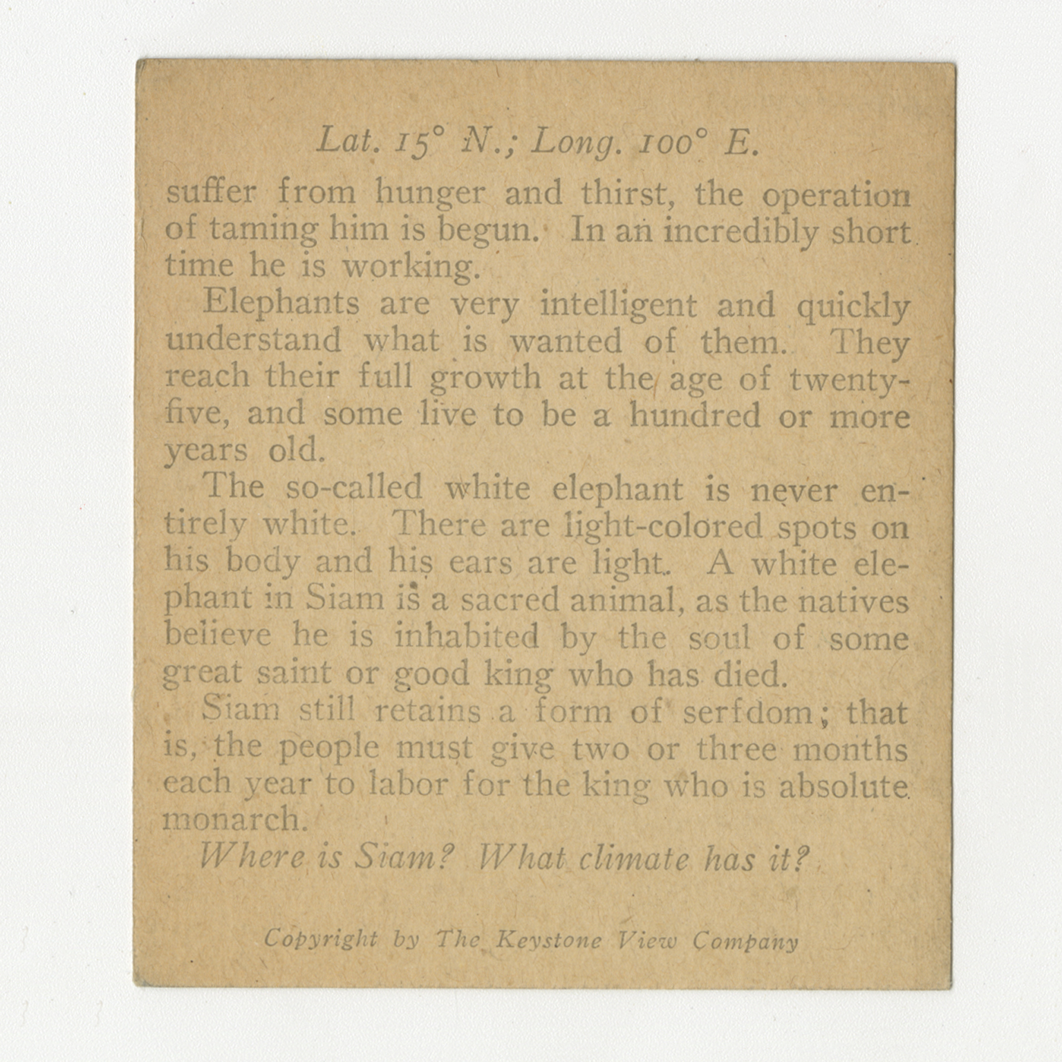 suffer from hunger and thirst, the operation of taming him is begun. In an incredibly short time he is working. Elephants are very intelligent and quickly understand what is wanted of them. They reach their full growth at the age of twenty-five, and some live to be a hundred or more years old. The so-called white elephant is never entirely white. There are light-colored spots on his body and his ears are light. A white elephant in Siam is a sacred animal, as the natives believe he is inhabited by the soul of some great saint or good king who has died. Siam still retains a form of serfdom; that is, the people must give two or three months each year to labr for the king who is absolute monarch. Where is Siam? What climate has it?