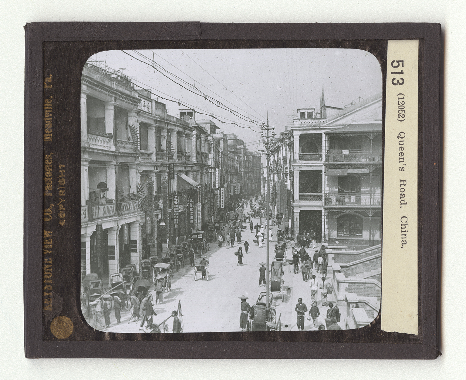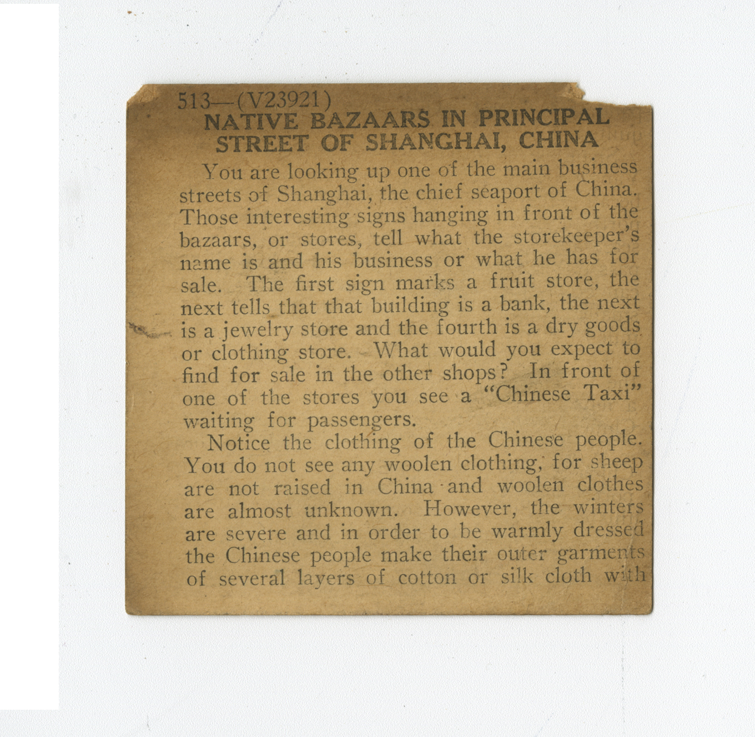 You are looking up one of the main business streets of Shanghai, the chief seaport of China. Those interesting signs hanging in front of the bazaars, or stores, tell what they storekeeper's name is and his business or what he has for sale. The first sign marks a fruit store, the next tells that that building is a bank, the next is a jewelery store and the fourth is a dry goods and clothing store. What would you expect to find for sale in the other shops? In front of one of the stores you see a "Chinese Taxi" waiting for passengers. Notice the clothing of the Chinese people. You do not see any woolen clothing, for sheep are not raised in China and wollen clothes are almost unknown. Howeer, the winters are severe and in order to be warmly dressed the Chinese people make their outer garments of several layers of cotton or silk cloth with