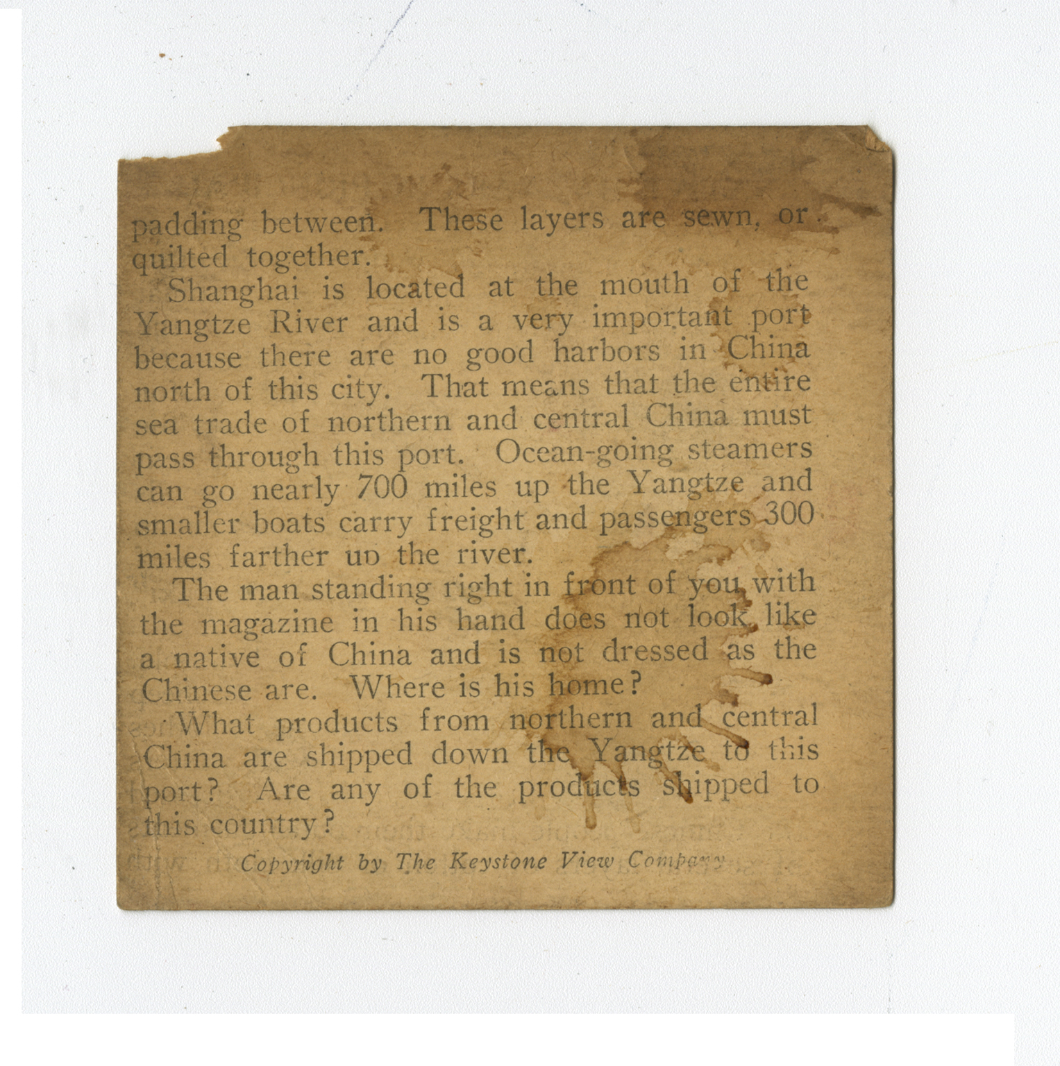 padding between. These layers are sewn, or quilted together. Shanghai is located at the mouth of the Yangtze River and is a very important port because there are no good harbors in China north of this city. That means that the entire sea trade of northern and central China must pass through this port. Ocean-going steamers can go nearly 700 miles up they Yangtze and smaller boats carry freight and passengers 300 miles farther up the river. The man standing right in front of you with the magazine in his hand does not look like a native of China and is not dressed as the Chinese are. Where is his home? What products from northern and central China are shipped down the Yangtze to this port? Are any of the products shipped to this country?