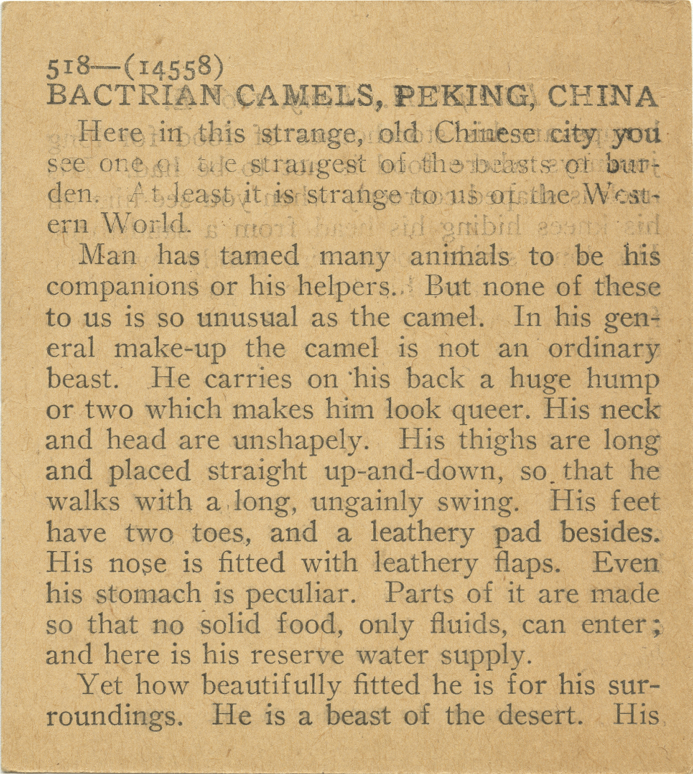 Here in this strange, old Chinese city you see one of the strangest of the beasts of burden. At least it is strange to us of the Western World. Man has tamed many animals to be his companions or his helpers. But none of these to us is so unusual as the camel. In his general make-up the camel is not an ordinary beast. He carries on his back a huge hump or two which makes him look queer. His neck and head are unshapely. His thighs are long and placed straight up-and-down, so that he walks with a long, ungainly swing. His feet have two toes, and a leathery pad besides. His nose is fitted with leathery flaps. Even his stomach is peculiar. Parts of it are made so that no solid food, only fluids can enter; and here is his reserve water supply. Yet how beautifully fitted he is for his surroundings. He is a beast of the desert. His