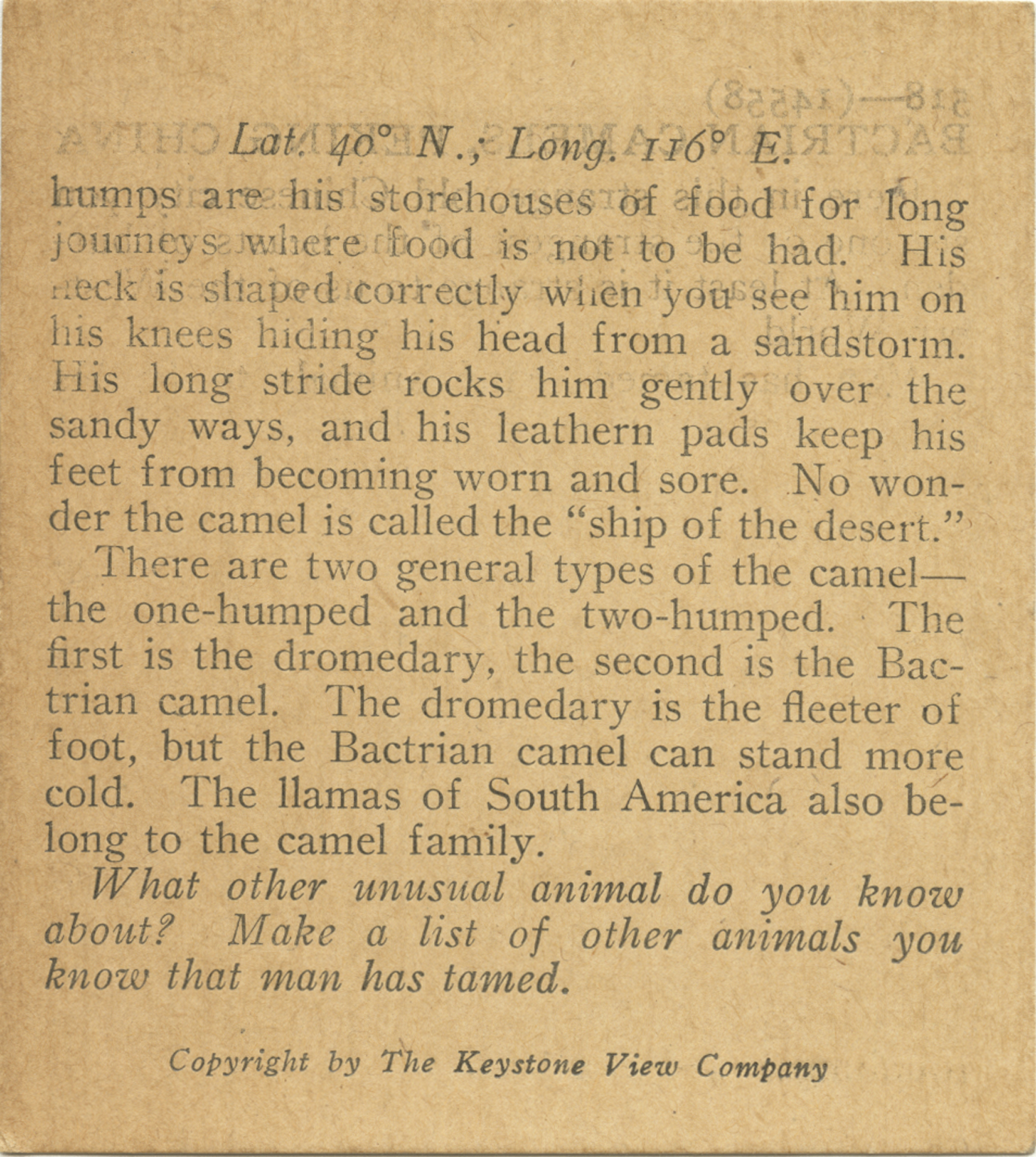 humps are his storehouses of food for long journeys where food is not to be had. His neck is shaped correctly when you see him on his knees hiding his head from a sandstorm. His long stride rocks him gently over the sandy ways, and his leathern pads keep his feet from becoming worn and sore. No wonder the camel is called the "ship of the desert." There are two general types of the camel - the one-humped and the two-humped. The first is the dromedary, the second is the Bactrian camel. The dromedary is the fleeter of foot, but the Bactrian camel can stand more cold. The llamas of South America also belong to the camel family. What other unusual animal do you know about? Make a list of other animals you know that man has tamed.