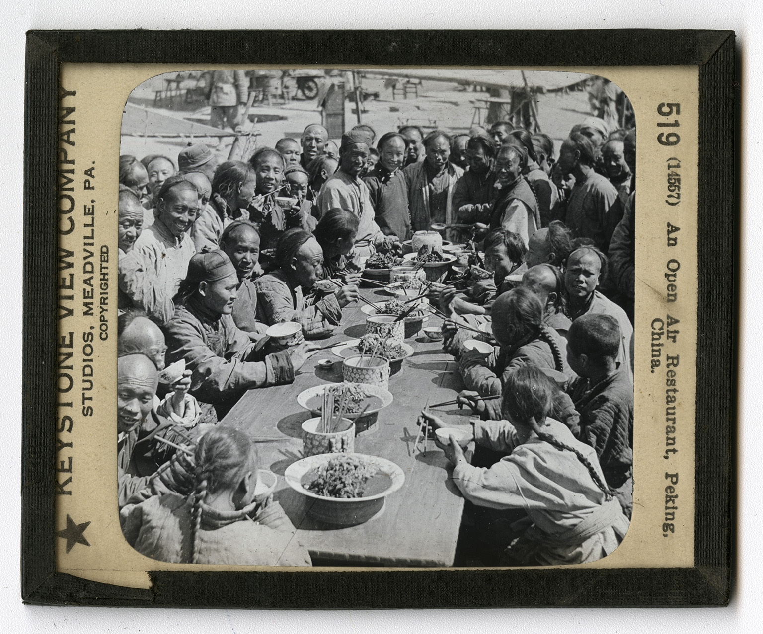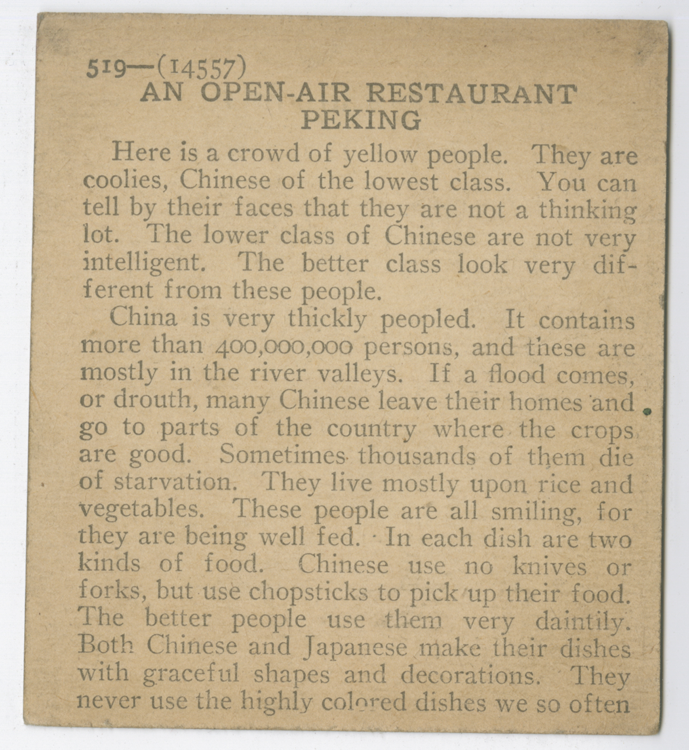 Here is a crowd of yellow people. They are coolies, Chinese of the lowest class. You can tell by their faces that they are not a thinking lot. The lower class of Chinese are not very intelligent. The better class look very differently from these people. China is very thickly peopled. It contains more than 400,000,000 persons, and these are mostly in the river valleys. If a flood comes, or drought, many Chinese leave their homes and go to parts of the country where the crops are good. Sometimes thousands of them die of starvation. They live mostly upon rice and vegetables. There people are all smiling, for they are being well fed. In each dish are two kinds of food. Chinese use no knives or forks, but use chopsticks to pick up their food. The better people use them very daintily. Both Chinese and Japanese make their dishes with graceful shapes and decorations. They never use the highly colored dishes we so often
