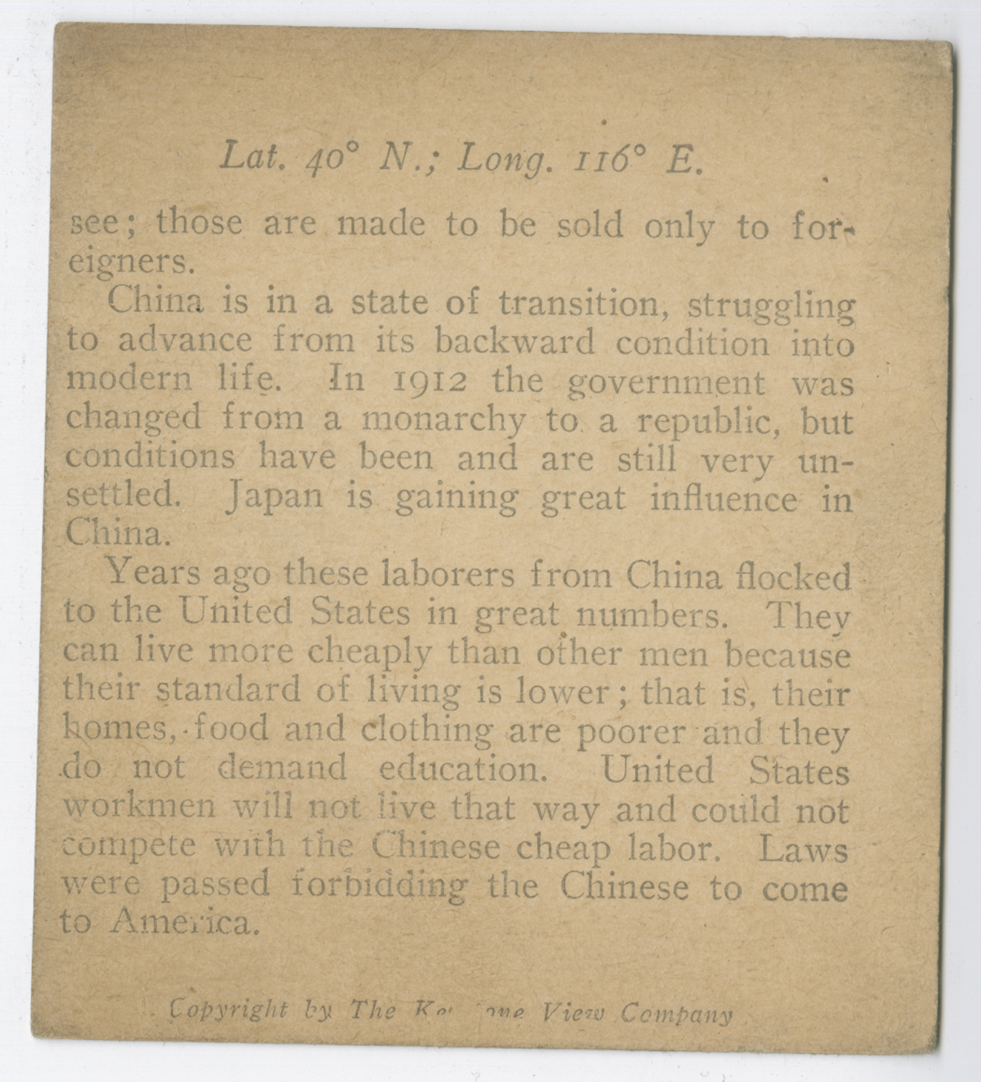 see; those are made to be sold only to foreigners. China is in a state of transition, struggling to advance from its backward condition into modern life. In 1912 the government was changed from a monarchy to a republic, but conditions have been and are still very unsettled. Japan is gaining great influence in China. Years ago these laborers from China flocked to the United States in great numbers. They can live more cheaply than other men because their standard of living is lower; that is, their homes, food and clothing are poorer and they do not demand education. United States workmen will not live that way and could not compete with the Chinese cheap labor. Laws were passed forbidden the Chinese to come to America.