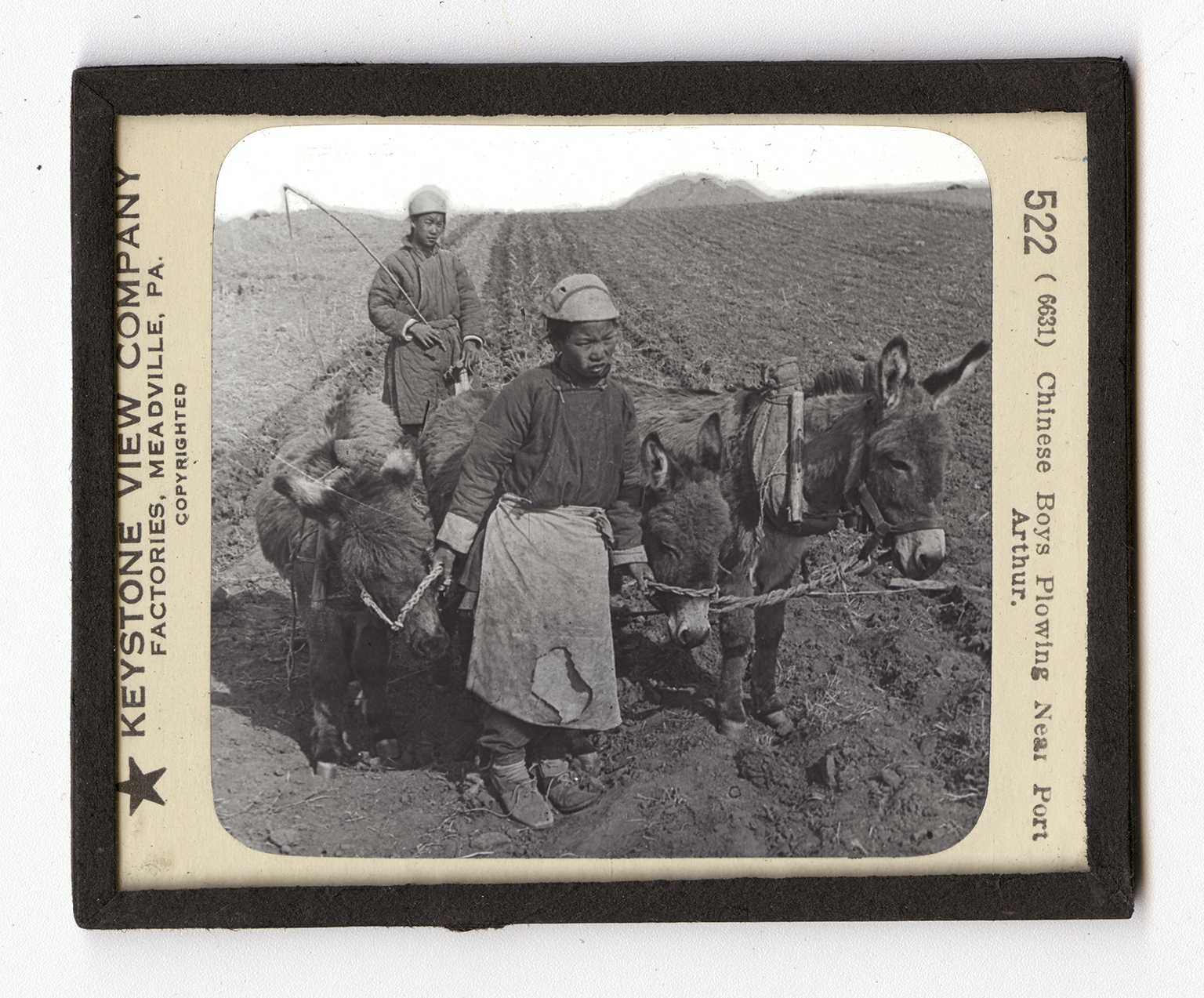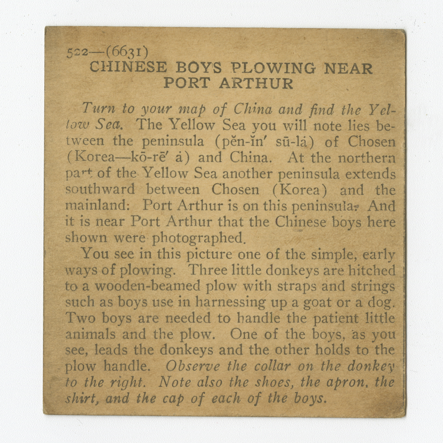 Turn to your map of China and find the Yellow Sea. The Yellow Sea you will note lies between the peninsula of Chosen (Korea) and China. At the northern part of the Yellow Sea another peninsula extends southward between Chosen (Korea) and the mainland: Port Arthur is on this peninsula. And it is near Port Arthur that the Chinese boys here shown were photographed. You see in this picture one of the simple, early ways of plowing. Three little donkeys are hitched to a wooden-beamed plow with straps and strings such as boys use in harnessing up a goat or a dog. Two boys are needed to handle the patient little animals and the plow. One of the boys, as you see, leads the donkeys and the other holds to the plow handle. Observe the collar on the donkey to the right. Note also the shoes, the apron, the shirt, and the cap of each of the boys.