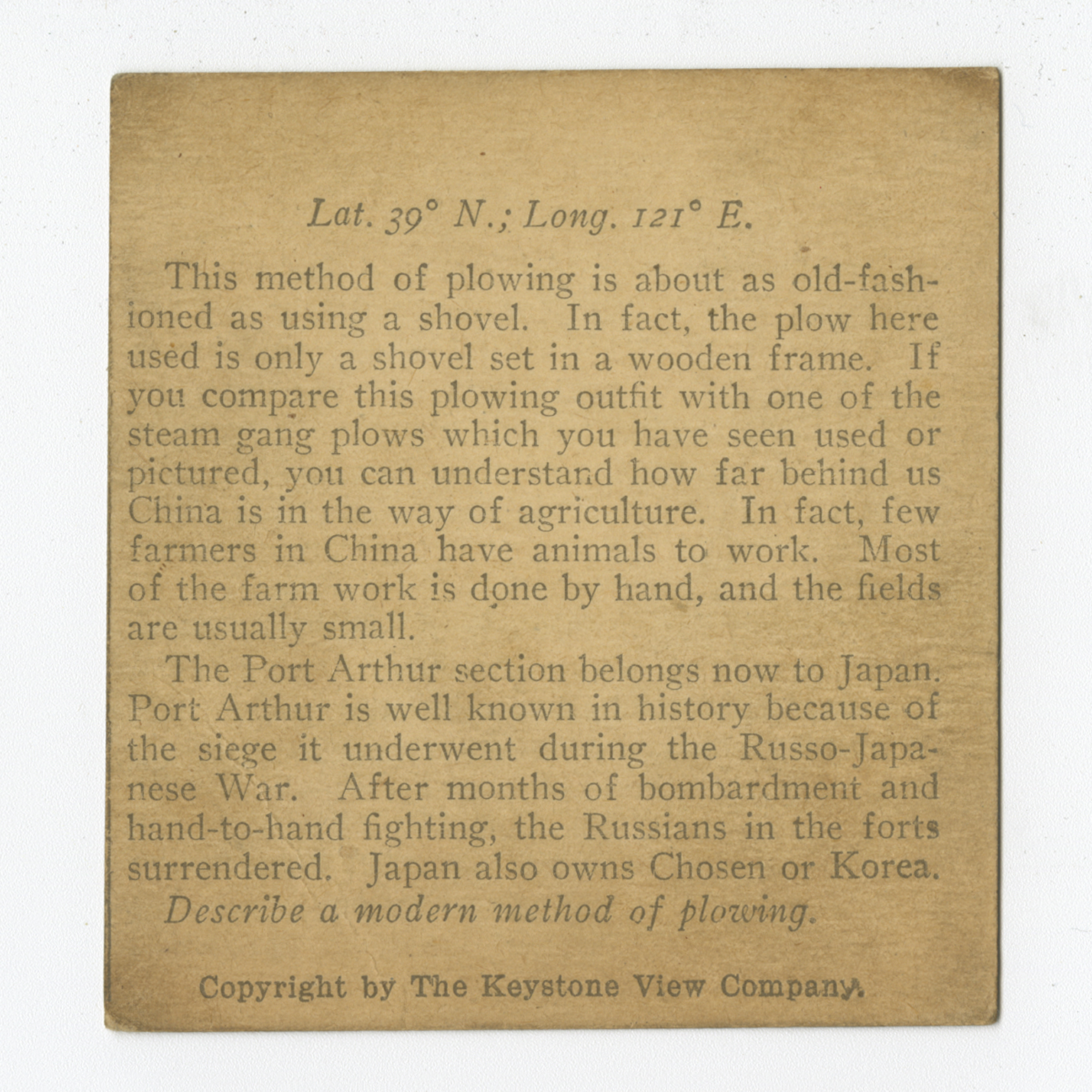 This method of plowing is about as old-fashioned as using a shovel. In fact, the plow here used is only a shovel set in a wooden frame. If you compare this plowing outfit with one of the steam gang plows which you have see used or pictured, you can understand how far behind us China is in the way of agriculture. In fact, few farmers in China have animals to work. Most of the farm work is done by hand, and the fields are usually small. The Port Arthur section belongs now to Japan. Port Arthur is well known in history because of the siege it underwent during the Russo-Japanese War. After months of bombardment of hand-to-hand fighting, the Russians in the forts surrendered. Japan also owns Chosen or Korea. Describe a modern method of plowing.
