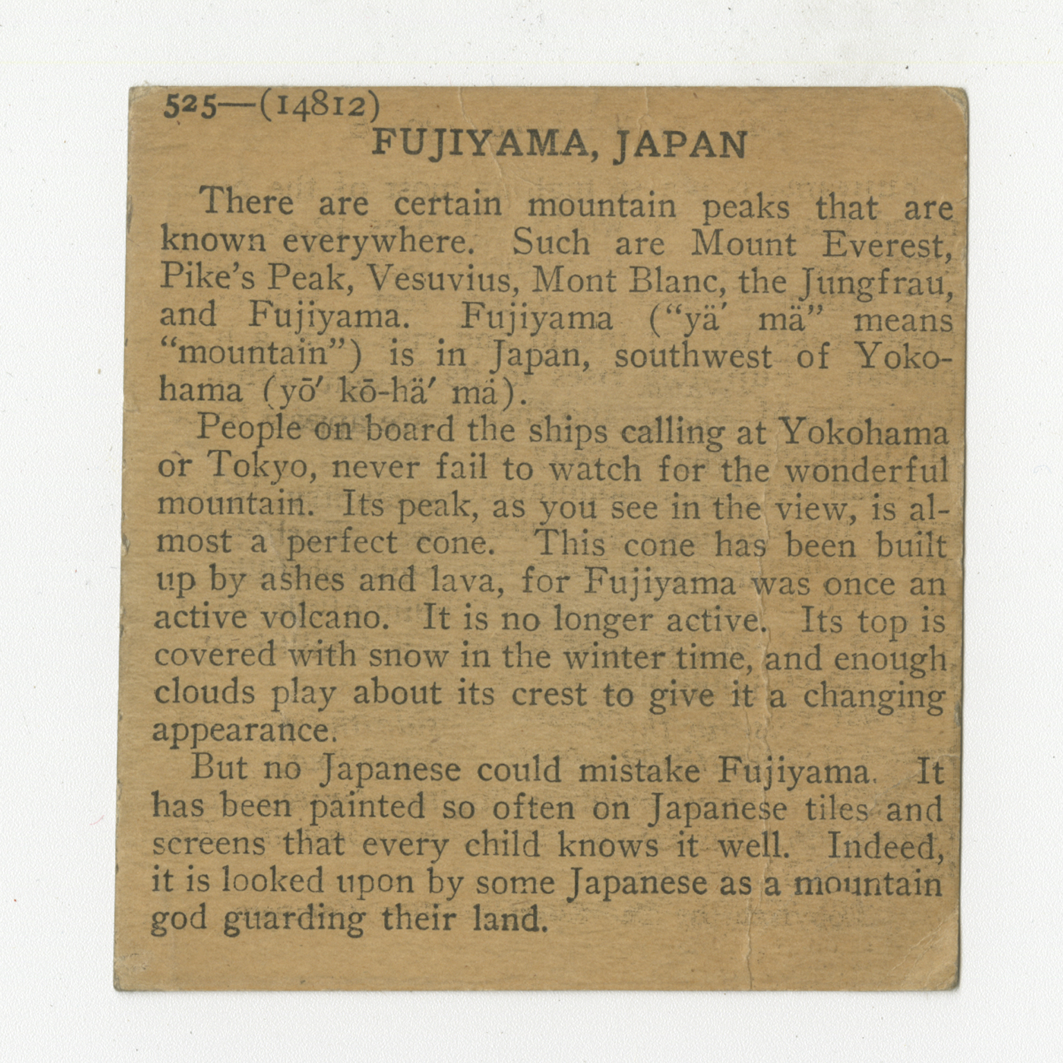 There are certain mountain peaks that are known everywhere. Such are Mount Everest, Pike's Peak, Vesuvius, Mont Blanc, the Jungfrau, and Fujiyama. Fujiyama ("ya' ma" means "mountain") is in Japan, southwest of Yokohama. People on board the ships calling at Yokohama of Tokyo, never fail to watch for the wonderful mountain. Its peak, as you see in the view, is almost a perfect cone. This cone has been built up by ashes and lava, for Fujiyama was once an active volcano. It is no longer active. Its top is covered with snow in the winter time, and enough clouds play about its crest to give it a changing appearance. But no Japanese could mistake Fujiyama. It has been painted so often on Japanese tiles, and screens that every child knows it well. Indeed, it is looked upon by some Japanese as a mountain god guarding their land.