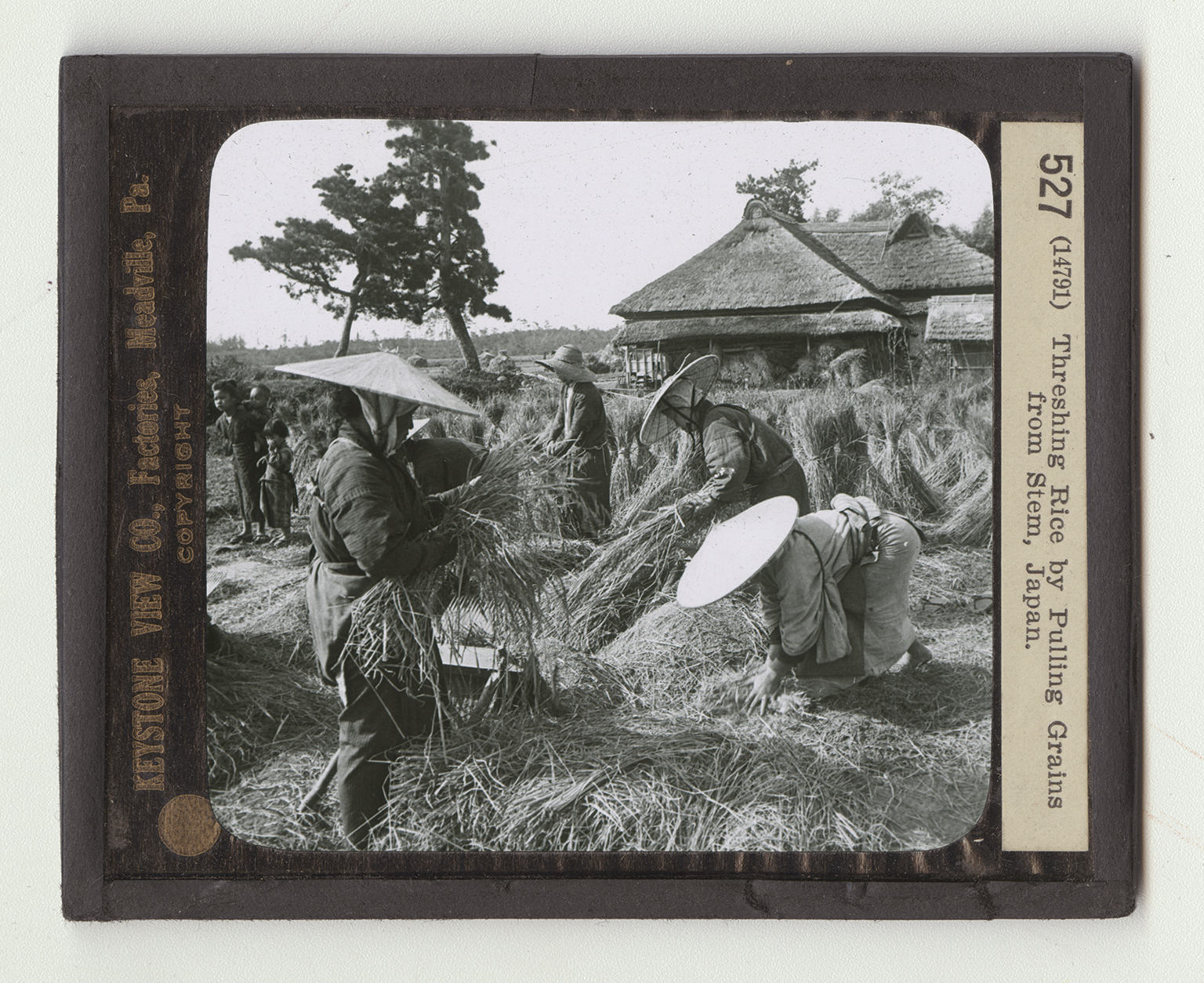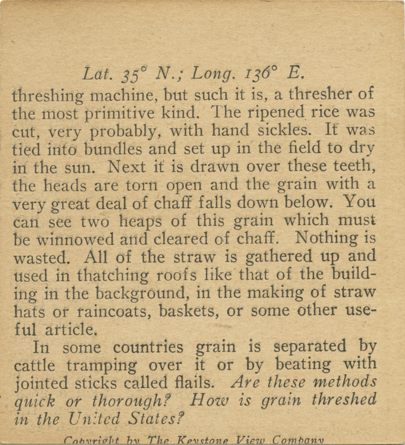 threshing machine, but such it is, a thresher of the most primitive kind. The ripened rice was cut, very probably, with hand sickles. It was tied into bundles and set up in the field to dry in the sun. Next it is drawn over these teeth, the heads are torn open and the grain with a very great deal of chaff falls down below. You can see two heaps of this grain which must be winnowed and cleared of chaff. Nothing is wasted. All of the straw is gathered up and used in thatching roofs like that of the building in the background, in the making of straw hats or raincoats, baskets, or some other useful article. In some countries grain is separated by cattle tramping over it or by beating with jointed sticks called flails. Are these methods quick or thorough? How is grain threshed in the United States?