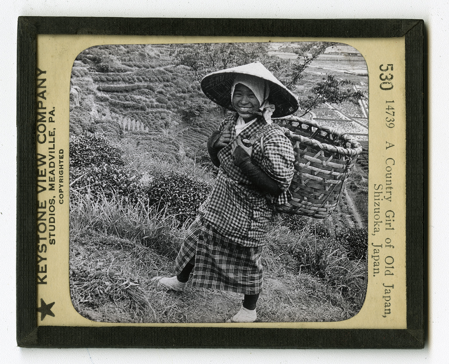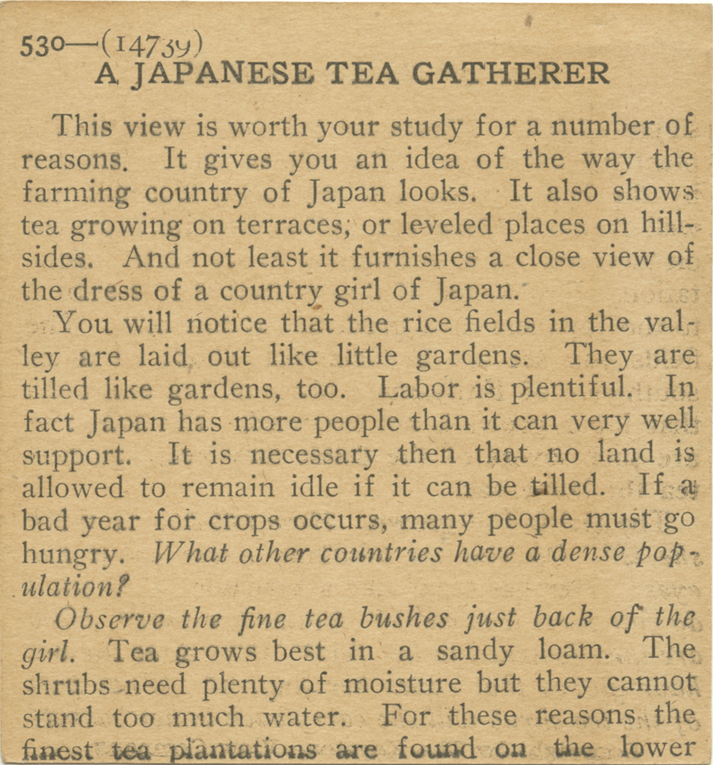 This view is worth your study for a number of reasons. It gives you an idea of the way the farming country of Japan looks. It also shows tea growing on terraces, or leveled places on hillsides. And not least it furnished a close view of the dress of a country girl of Japan. You will notice that the rice fields in the valley are laid out like little gardens. They are tilled like gardens, too. Labor is plentiful. In fact Japan has more people than it can carry well support. It is necessary then that no land is allowed to remain idle if it can be tilled. If a bad year for crops occurs, many people must go hungry. What other countries have a dense population? Observe the fine tea bushes just back of the girl. Tea grows best in a sandy loam. The shrubs need plenty of moisture but they cannot stand too much water. For these reasons the finest tea plantations are found on the lower