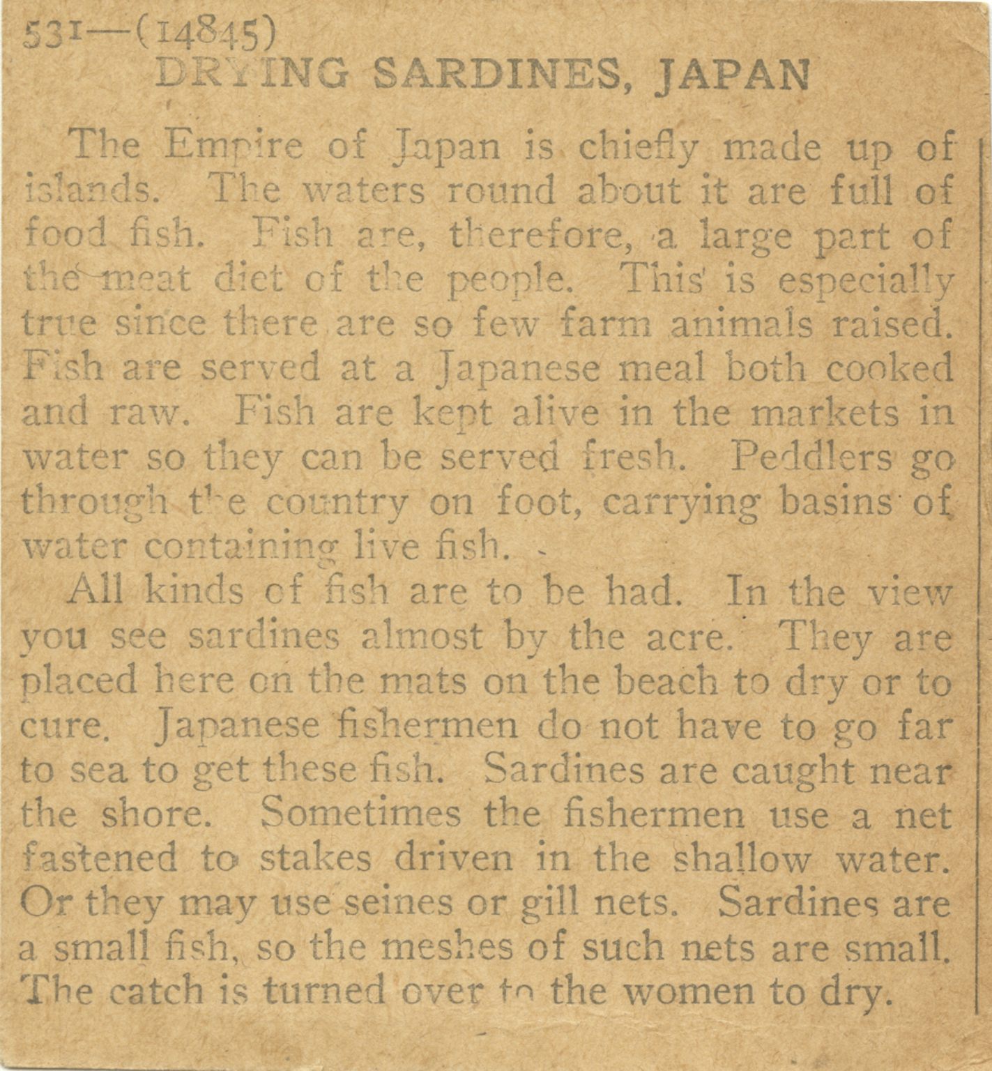 The Empire of Japan is chiefly made up of islands. The waters round about it are full of food fish. Fish are, therefore, a large part of the meat diet of the people. This is especially true since there are so few farm animals raised. Fish are served at a Japanese meal both cooked and raw. Fish are kept alive in the markets in water so they can be served fresh. Peddlers go through the country on foot, carrying basins of water containing live fish. All kinds of fish are to be had. In the view you see sardines almost by the acre. They are placed here on the mats on the beach to dry or to cure. Japanese fishermen do not have to go far to sea to get these fish. Sardines are caught near the shore. Sometimes the fishermen use a net fastened to stakes driven in the shallow water. Or they may use seines or gill nets. Sardines are a small fish, so the meshes of such nets are small. The catch is turned over to the women to dry.