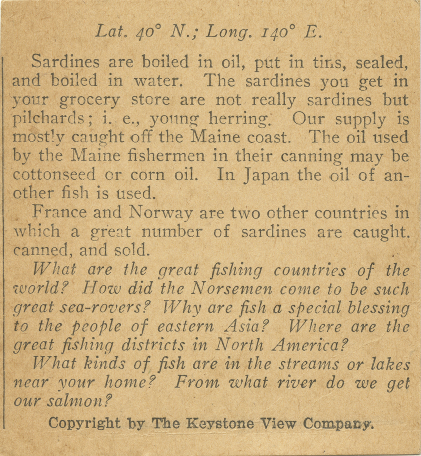 Sardines are boiled in oil, put in tins, sealed, and boiled in water. The sardines you get in your grocery store are not really sardines but pilchards; i.e., young herring. Our supply is mostly caught off the Maine coast. The oil used by the Maine fishermen in their canninf may be cottonseed or corn oil. In Japan the oil of another fish is used. France and Norway are two other countries in which a great number of sardines are caught, canned, and sold. What are the great fishing countries of the world? How did the Norsemen come to be such great sea-rovers? Why are fish a special blessing to the people of eastern Asia? Where are the great fishing districts in North America? What kinds of fish are in the streams or lakes near your home? From what river do we get our salmon?